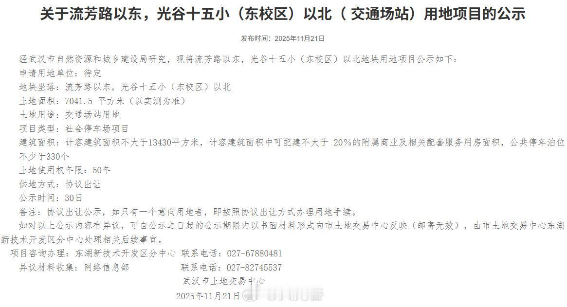 流芳路公共停车场用地公示! 武汉市土地交易中心获悉。11月21日,流芳路以东,光谷十五小(东校区)以北( 交通场站)用地项目的公示。土地面积:7041.5 平方米。计容建筑面积不大于13430平方米,计容建筑面积中可配建不大于 20%的附属商业及相关配套服务用房面积,公共停车泊位不少于330个。