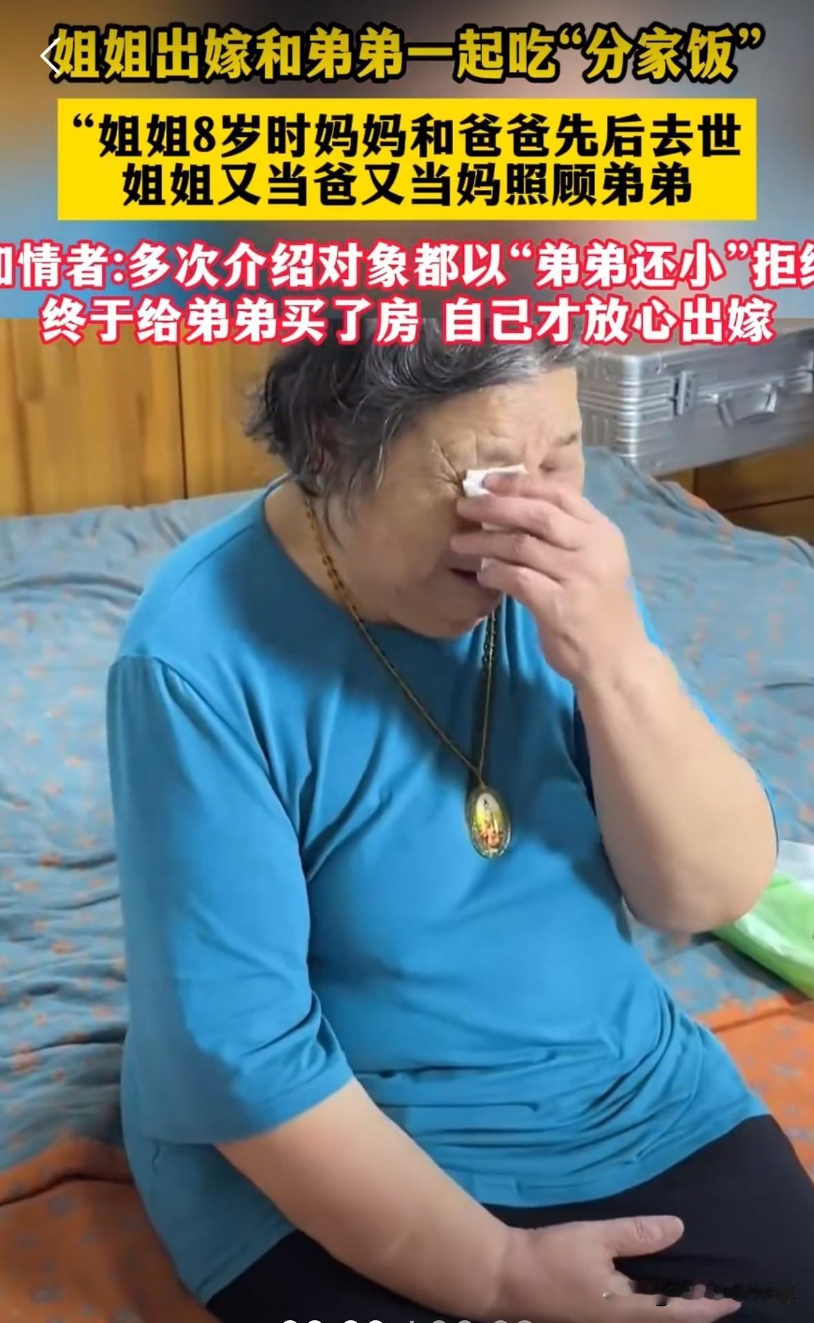 姐姐出嫁跟弟弟一起吃“分家饭”,心里万般不舍。 因为姐姐八岁时,爸爸妈妈就先后去世了,姐姐就担负起家庭重任,照顾比自己小三四岁的弟弟! 姐姐到了结婚的年龄,很多人都给姐姐介绍对象,但是姐姐总觉得弟弟还小,想再照顾弟弟几年。 直到今年终于给弟弟买了房子,把弟弟的一切安排妥当,自己才放心嫁出去。 姐姐是个有担当的好姐姐,但是弟弟就不好说了,两人差的也不是很大,弟弟为什么不凭自己的努力去买房子? 觉得姐姐会照顾自己,就一直吸姐姐的血吗! 希望姐姐以后不要成为“伏弟魔”,过好自己的日子。也希望弟弟知道护着姐姐!姐姐