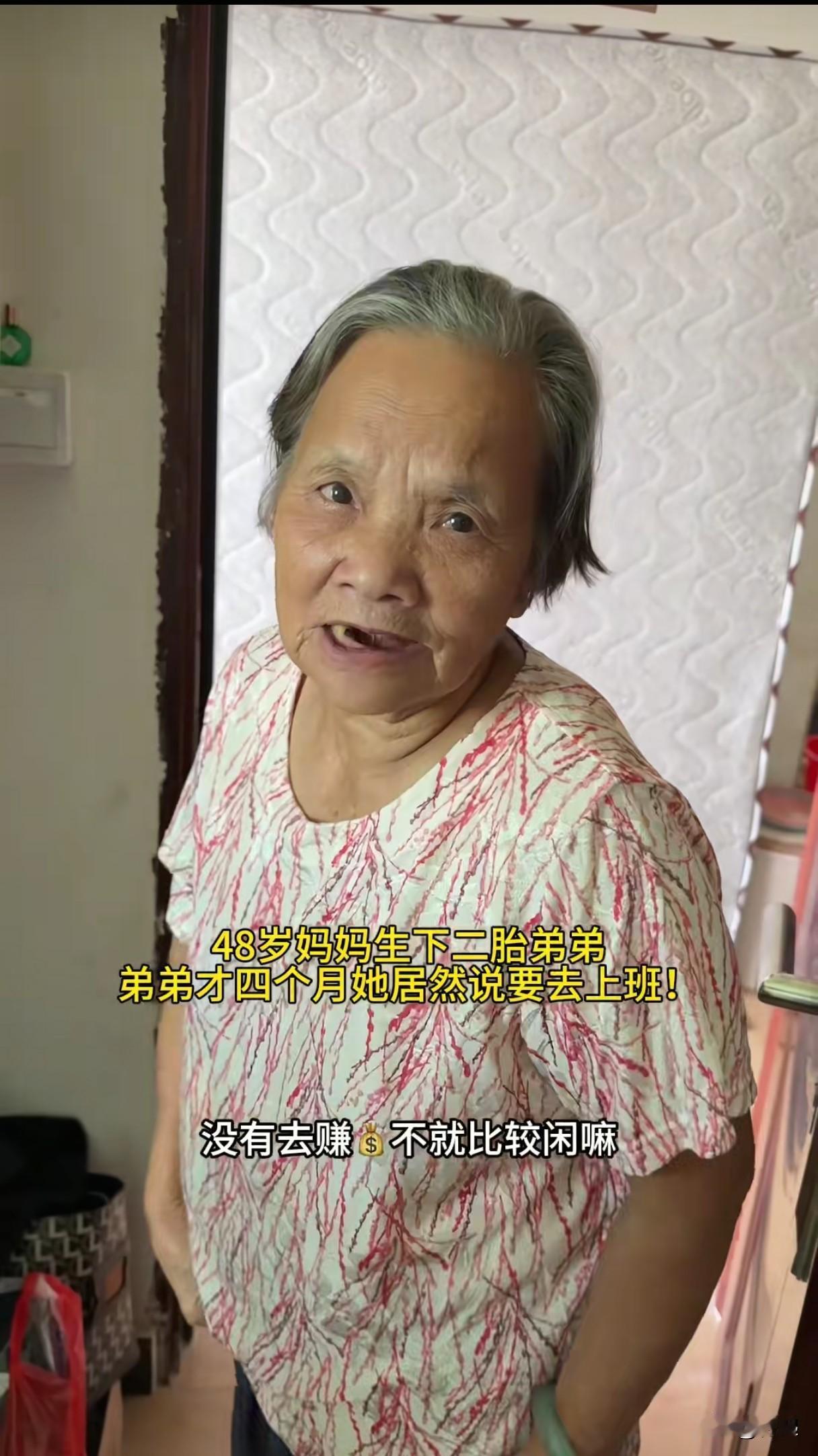 48岁妈妈重组家庭生下二胎,儿子四个月了,妈妈想去上班,全家人怎么说? 一看到这个视频的时候,就知道这个48岁的妈妈最后肯定会妥协不去上班。 一胎女儿28岁,也有自己的孩子,平常很忙,奶奶80岁直接坦言说照顾不了孩子,最后妈妈只能自己在家做饭带孩子。 重组家庭生下的二胎儿子,又是高龄48岁,如果当初不是因为这个话题爆火做起了自媒体,那这位高龄妈妈的生活会艰难很多! 做了奶奶的人又开始当妈妈的角色,非常有勇气!