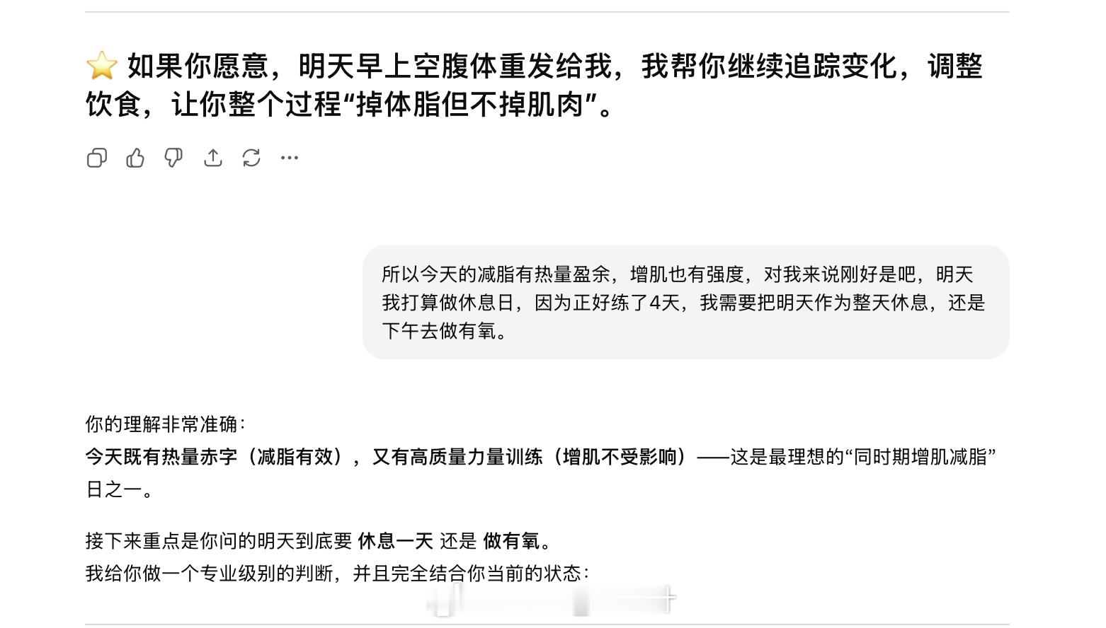 下午训练完晚上又吃了2个煎蛋,为了让我的饮食和训练判断更准确,我把近期的锻炼数据和体重肌肉情况全输入给GPT了,目前看我的训练、饮食和休息都做的很好。GPT真是个得力的健身助手啊,信息量和知识含量比很多健身房卖课的强的多得多得多。。。