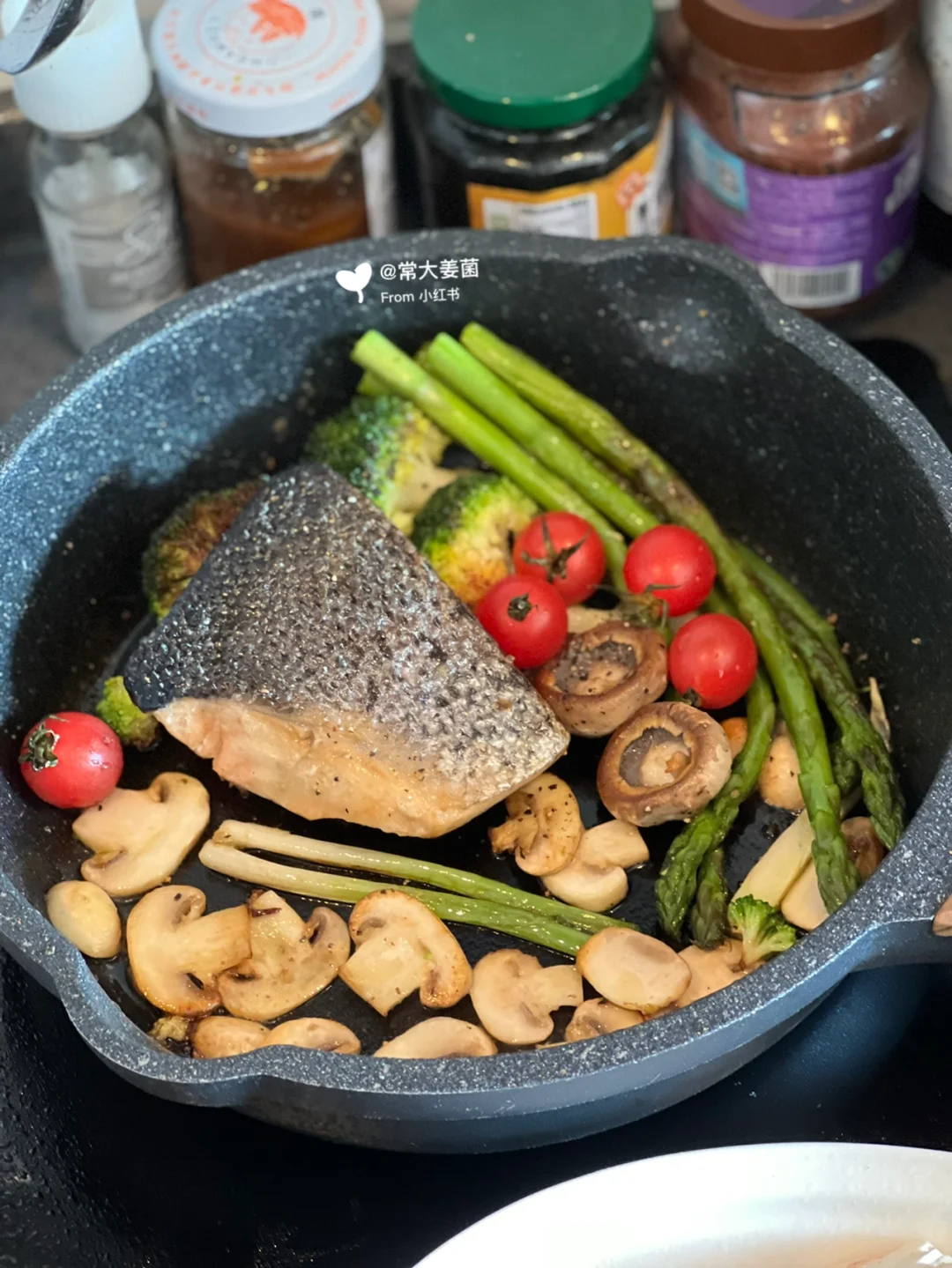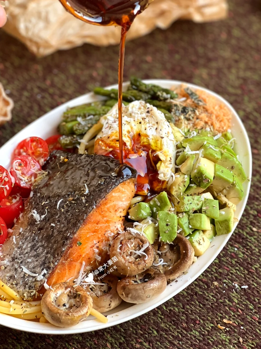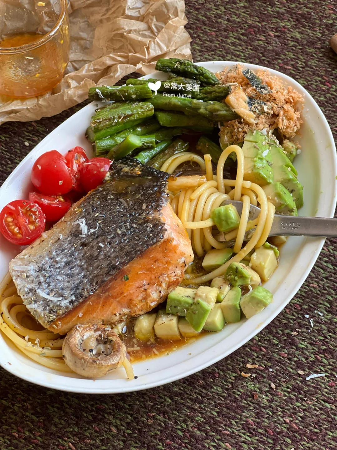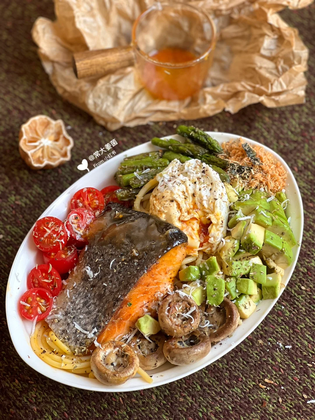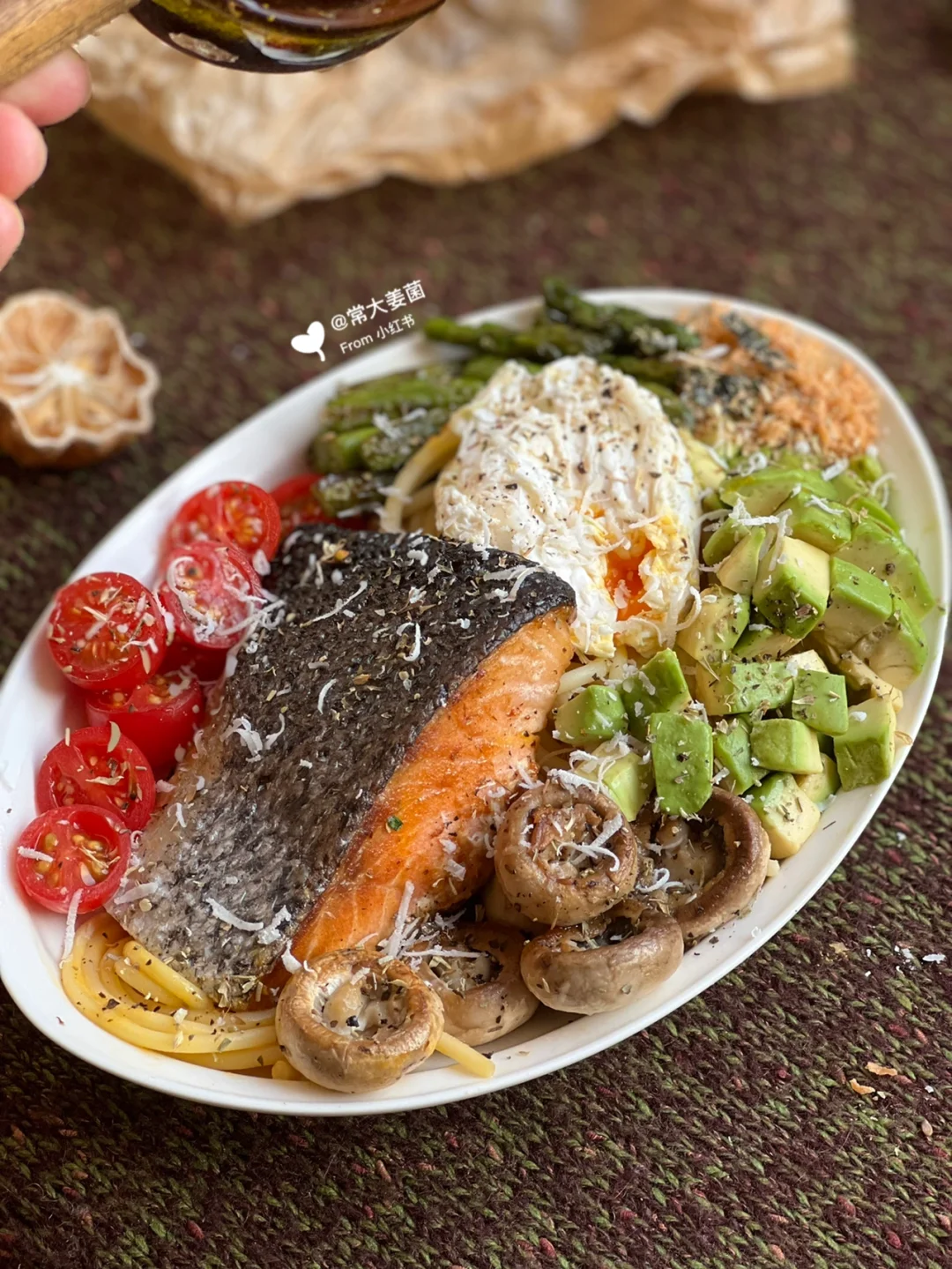芦笋、鸡蛋🥚番茄🍅口蘑🍄牛油果🥑三文鱼🐟全麦意面🍝……balabala再加每日不可少一把坚果子。
