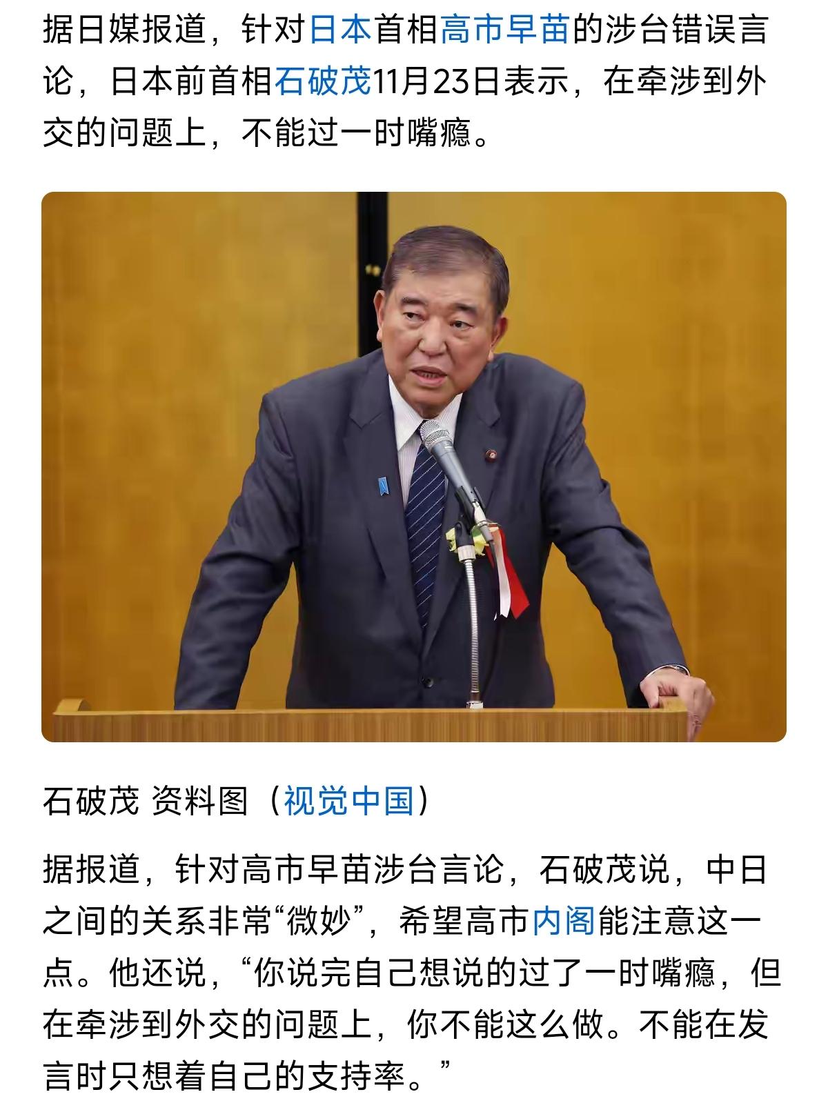 高市早苗这回真是惹了大祸, 连上一任日本首相石破茂, 都指责她不要过一时嘴瘾,也不知道高市早苗面对这么多骂声,会不会幡然醒悟呢? 我猜,这基本是已经很难了,因为从她一开始的行为,就基本可以确定,高市早苗大概率会跟咱们硬刚。 如果要追溯更早之前的话,那就是她还是安倍晋三的跟班时候,就确定高市早苗是个极端的右翼分子。 后来又改“和平协议”,把军费大幅度地提升了,现在又对咱们这边指指点点,妄想横插一脚。 这两天又爆出,高市早苗准备去靖国神社参拜,一个妇道人家,居然能够这么折腾! 不过说话回来,也不一定是坏事,这似乎是在给咱们制造契机。