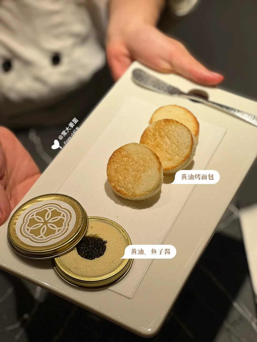 第一道菜,黄油抹在面包上点缀几颗鱼子酱,中规中矩~
