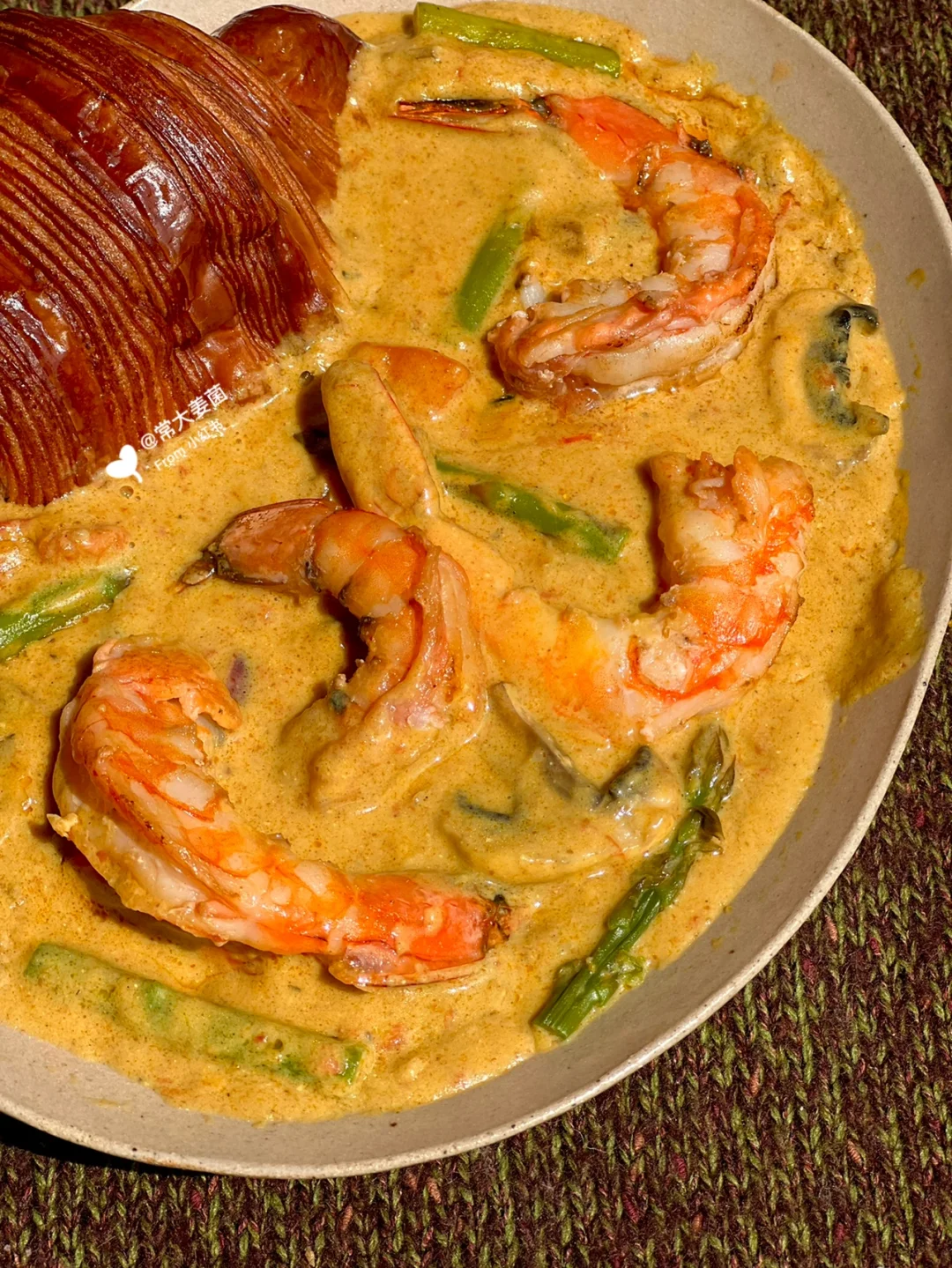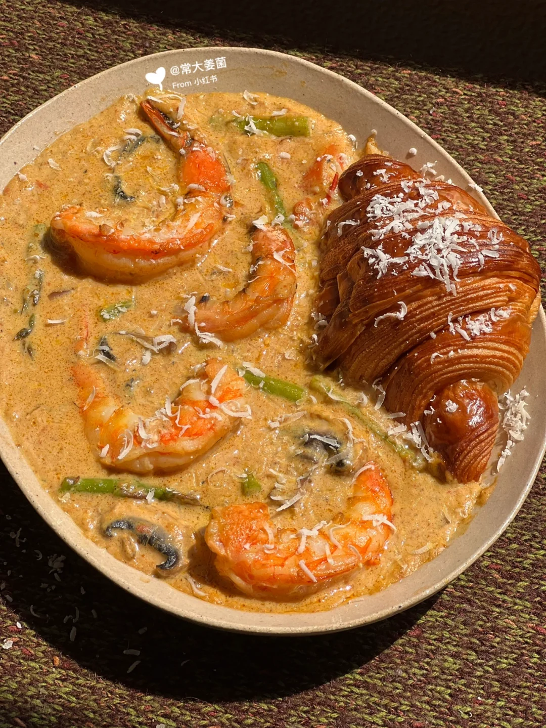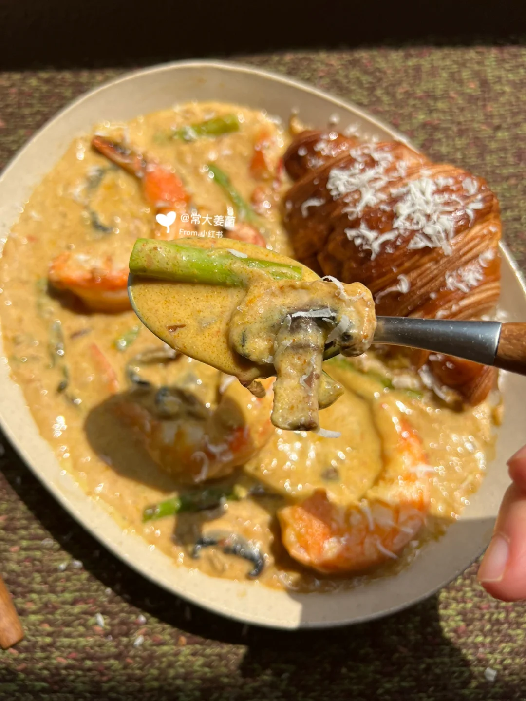 我在nya酱原配方里额外添加🍄口蘑➕🍤大虾,鲜甜更上一层楼!用香酥奶浓的可颂蘸着吃!简直无敌!!!