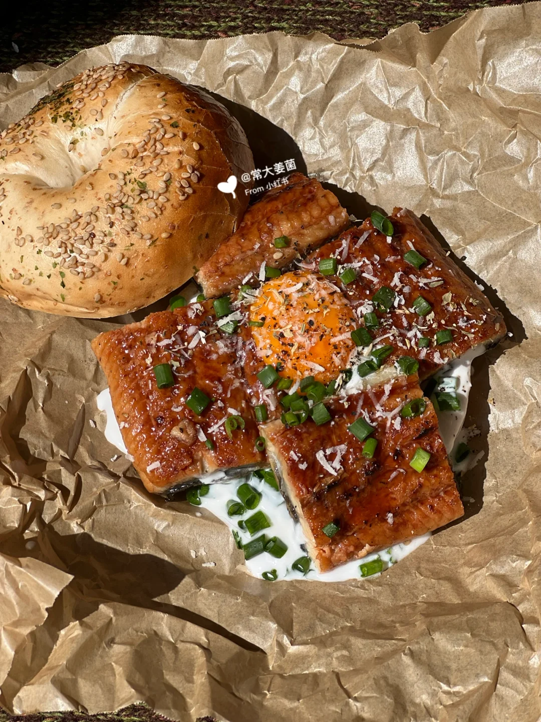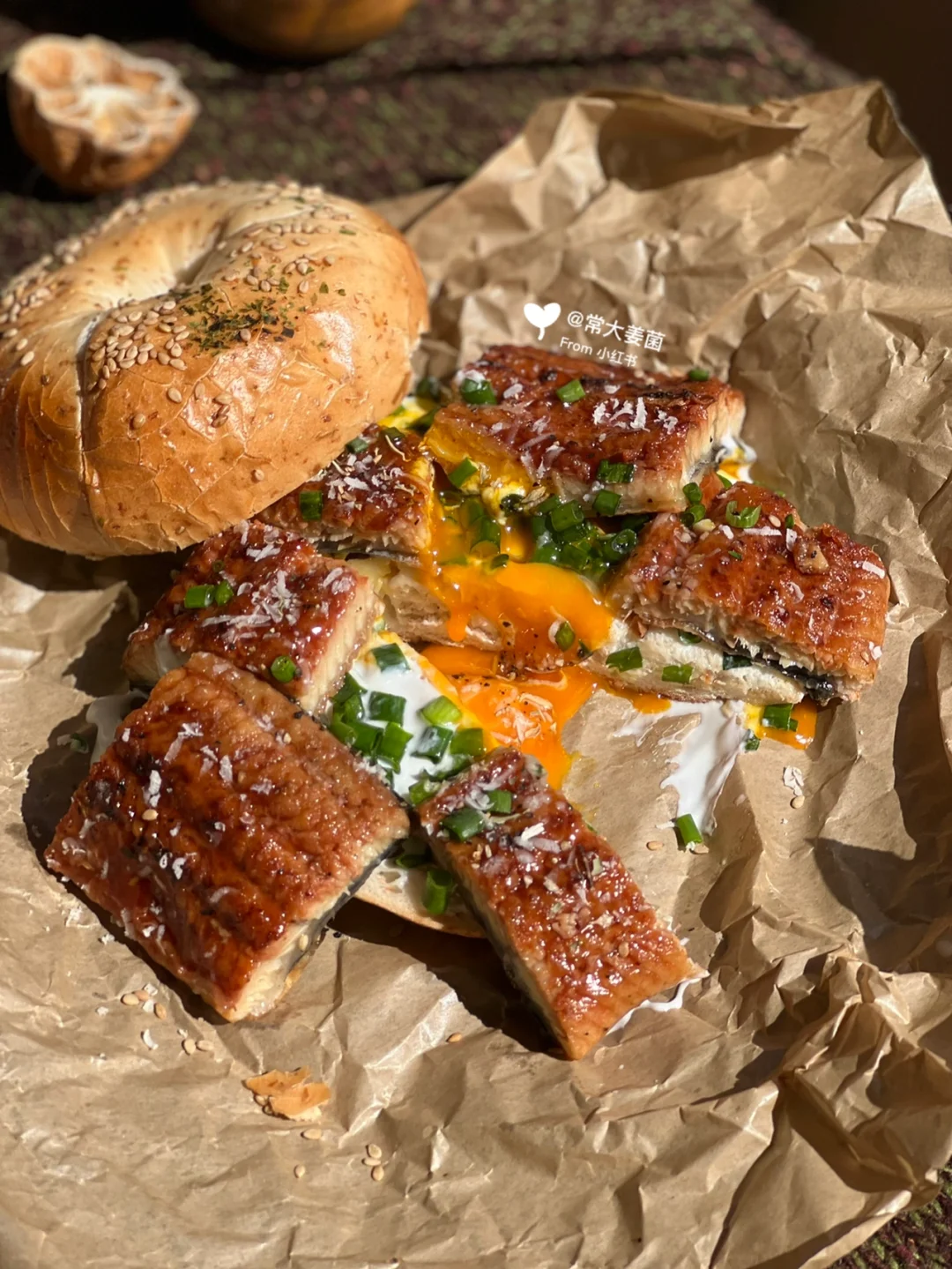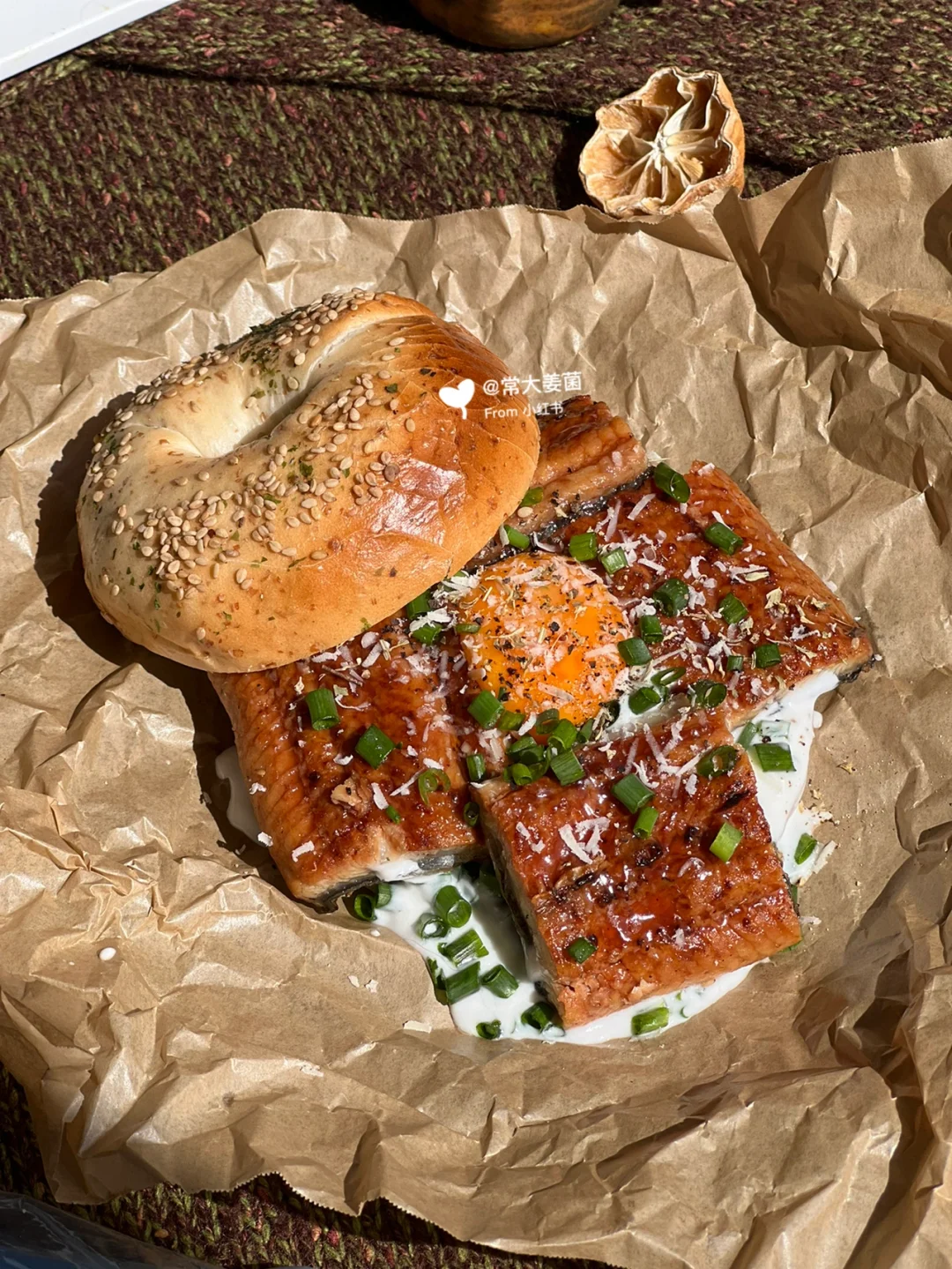 无敌好吃鳗鱼窝蛋&香葱奶酪酱🥯贝果三明治