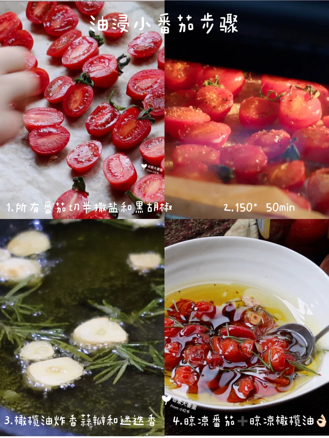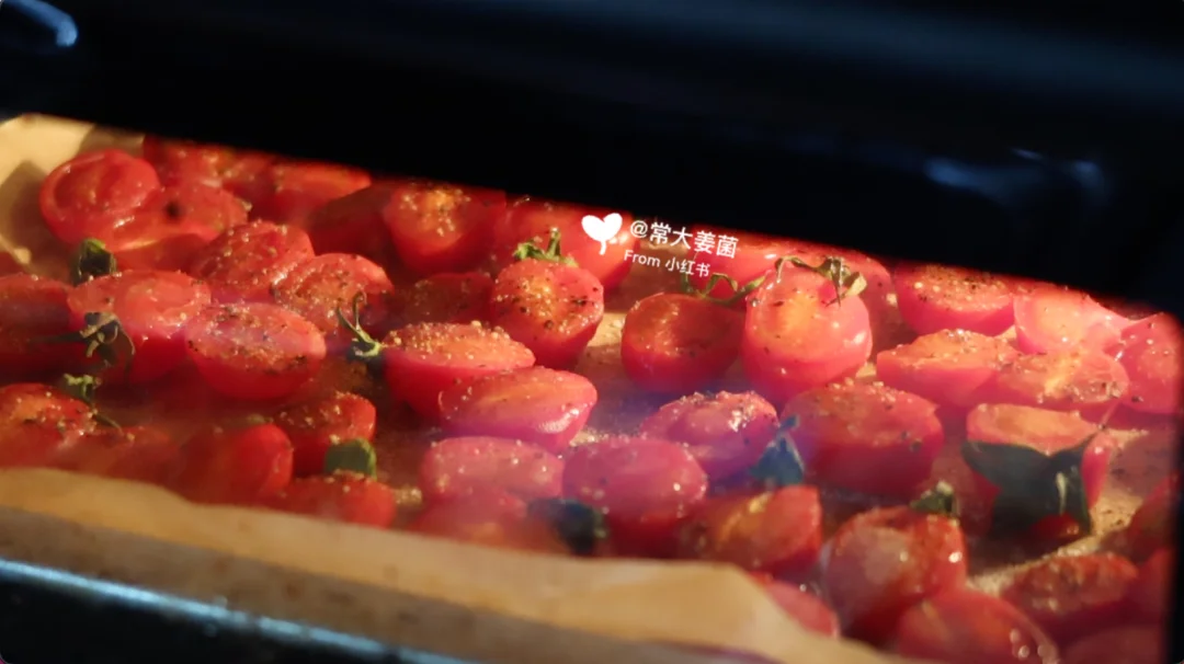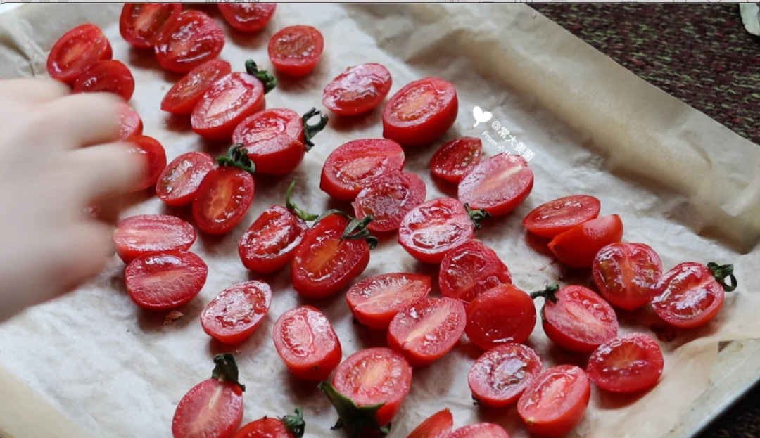1.番茄对半切撒盐➕黑胡椒,150°50min,晾凉