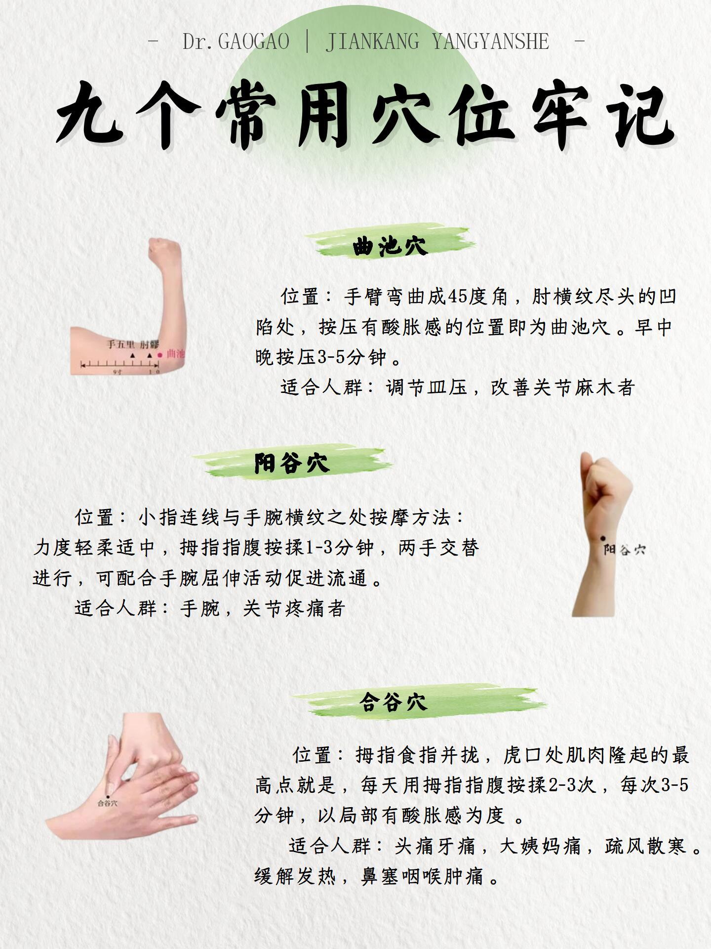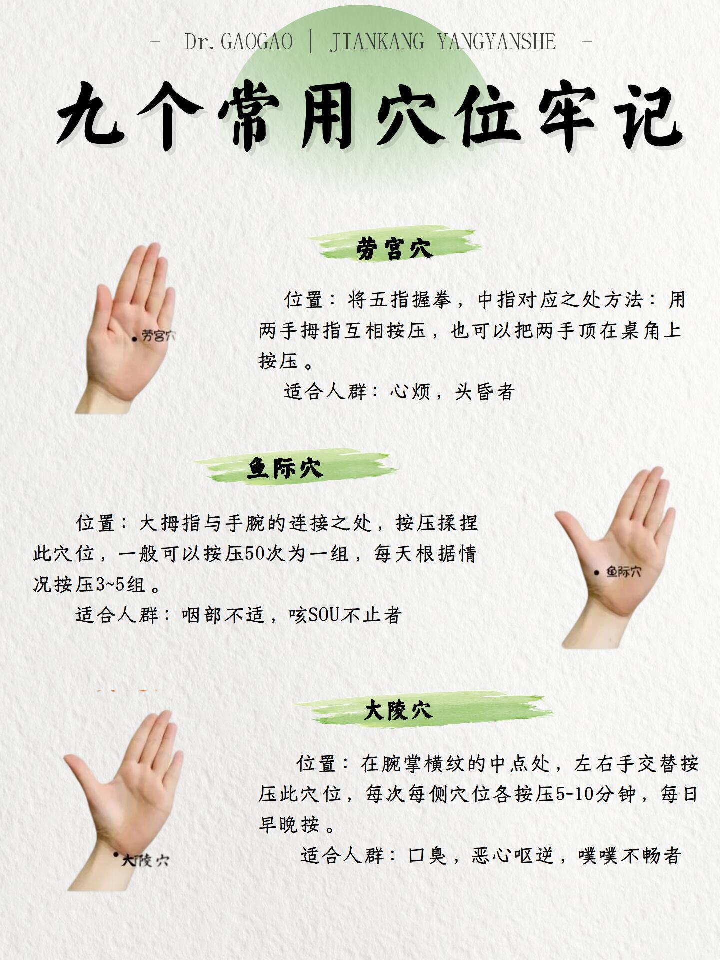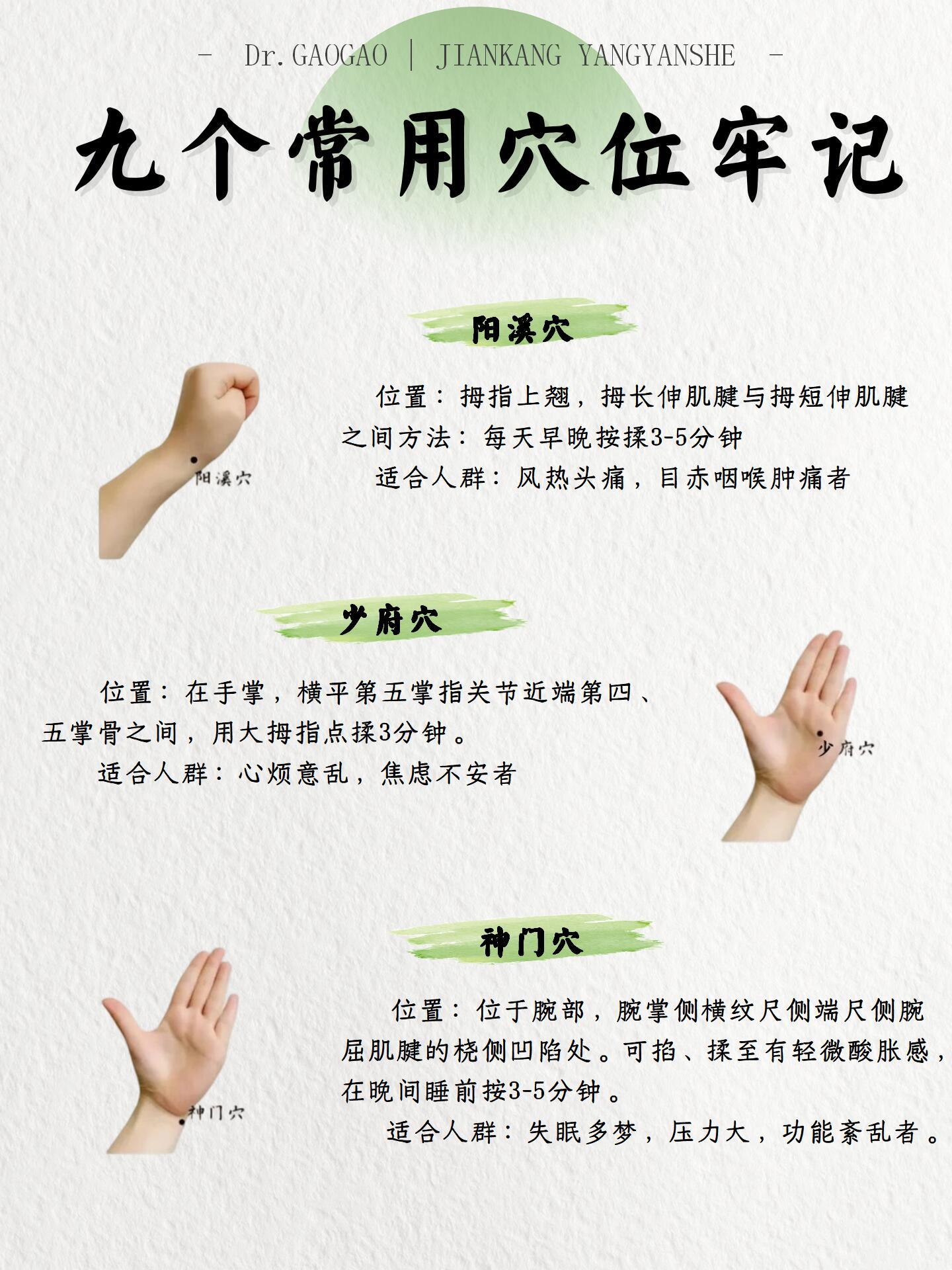 手部穴位👋|小小双手大大能量建议看完收藏💫小动作大作用《灵枢·本输》记载:“手之三阴,从脏走手”我们的双手藏着12条经络的起止点古人云“十指连心”原来暗藏玄机!🌿九大神仙穴位分享 1⃣ 劳宫穴2⃣ 鱼际穴3⃣ 大陵穴4️⃣阳溪穴5️⃣少府穴6️⃣神门穴7️⃣曲池穴8️⃣阳谷穴9️⃣合谷穴🌸使用小贴士✅搭配艾灸:每个穴位灸5分钟更佳✅禁忌人群:孕麻麻慎按合谷穴哦