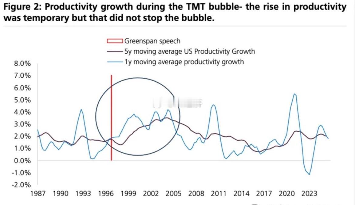瑞银(《全球股票策略:我们处于多大的泡沫中?峰值的警示信号是什么?》在2000年互联网泡沫期间,美国劳动生产率曾出现暂时性的大幅提升,其五年移动平均增速一度超过3%。这一轮由技术革命驱动的生产率跃升事后证明是短暂的,其并未阻止资产泡沫的形成。这一历史经验为当前由生成式人工智能(Gen AI)驱动的市场情绪提供了参照,即市场对资产的估值更多基于对未来生产率提升的“感知”而非现实。