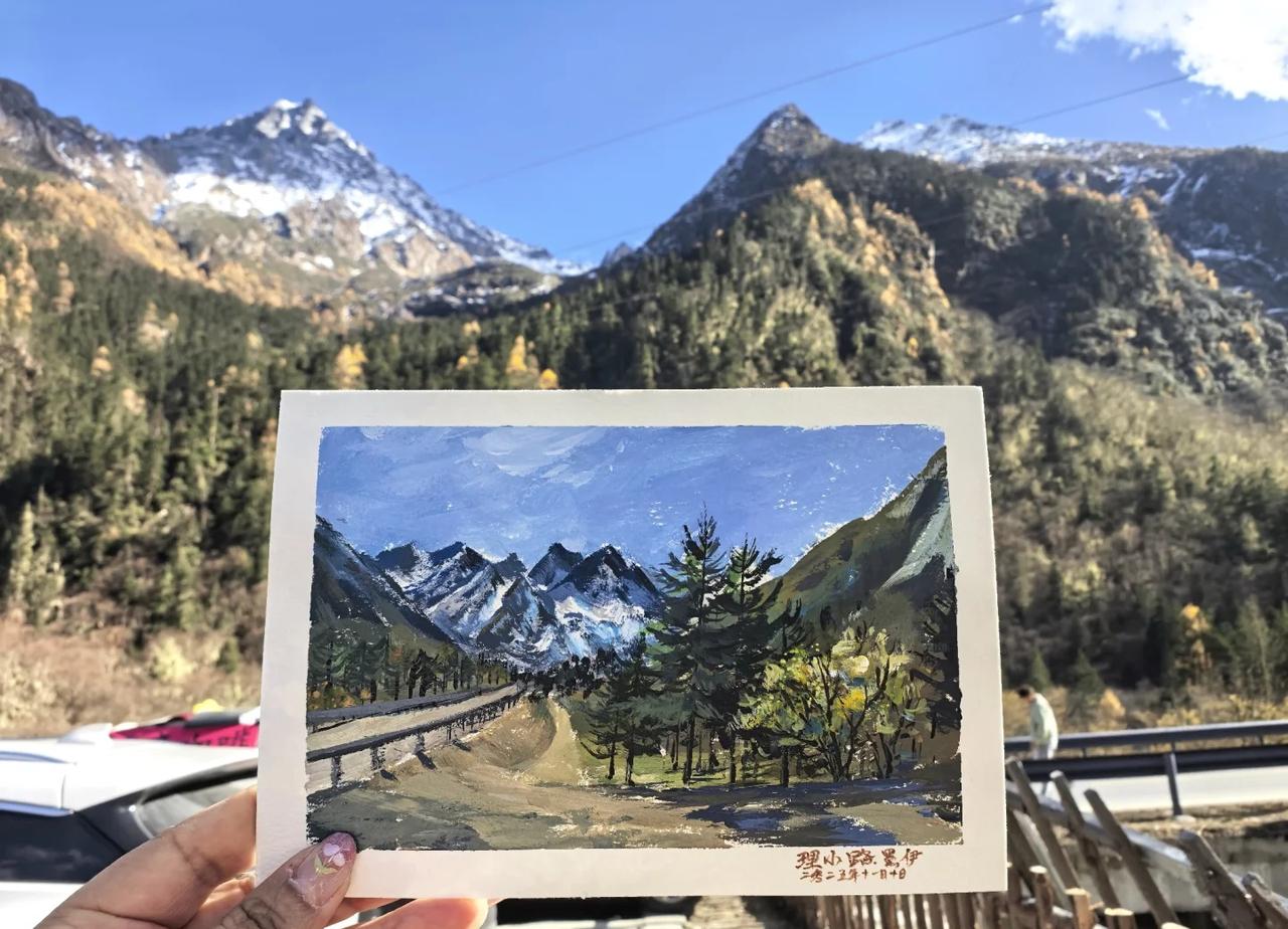 风景写生丨川西理小路的秋日以封神,速去! [亲一个R]成都自驾理小路一天往返,早上九点多我早以闪现到了理县挑苹果,对于爱出门的我来说,我宁愿少睡,也不愿堵路上(劝你们真的要么多早走) 🌼理县的苹果还是要十一月底去。现在的苹果糖心比较少,但还是新鲜好吃 在理县短暂停留直奔理小路,一路畅通,心情都变好了,远远就望见了雪山,一路的彩林也是达到最佳观赏期,非常漂亮 打卡了理小路的网红瀑布,就地写生,这个季节真好,既有雪山。也不是特别冷,完美[赞] 生活需要分享欲 清清日常库存 写生 丙烯画 生活画家创作挑战赛