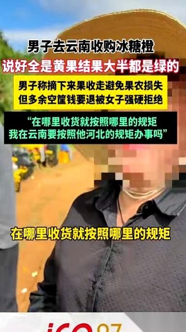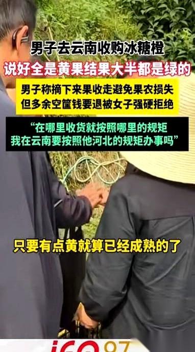最狠的不是货不对板。 是她连你准备装货的那些空箱子钱,都想给你黑了。 这事儿简直了。说好的一车“全黄”冰糖橙,老板大老远跑过去,到了地头一看,好家伙,绿油油一片,生机盎然的,不知道的还以为到了哪个自然保护区。 这换谁谁不懵啊? 老板也算厚道,说行吧,为了不让果农白忙活,已经摘下来的我要了,剩下的青果就算了。 大家都不容易。 但你得多收我那些空箱子的钱退给我吧?我可是按一整车的量给你打的钱啊。 你猜怎么着? 人家女的直接一句怼回来:我们这儿的规矩,有点黄就算熟了,你得“入乡随俗”。箱子运来了,就没有退钱的道理。 我听完都气笑了。 这哪是“入乡随俗”啊大姐,这叫“为你量身定做的规矩”。 生意场上最怕的,就是这种把不讲信用包装成“地方特色”的人。 合同精神是什么?是契约。 说好了全黄,那就是能直接上市卖钱的黄。 你这青疙瘩收回去,卖给谁?砸的可是我自己的招牌。凭什么你为了降低自己的风险,就要把损失全转嫁给别人? 还说什么再等等就落果了,果农损失大…… 这话说的,果农的损失,是你当初胡乱承诺造成的,还是天气造成的? 一码归一码。 说白了,就是看你人来了,货在这儿了,想拿捏你,欺负你外地人。 别拿“淳朴”和“规矩”当挡箭牌了。 真正的规矩,天下只有一条,叫“诚信”。