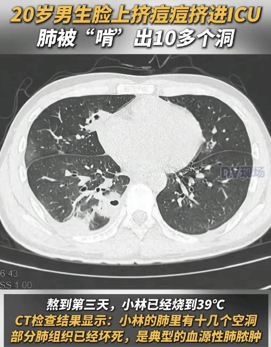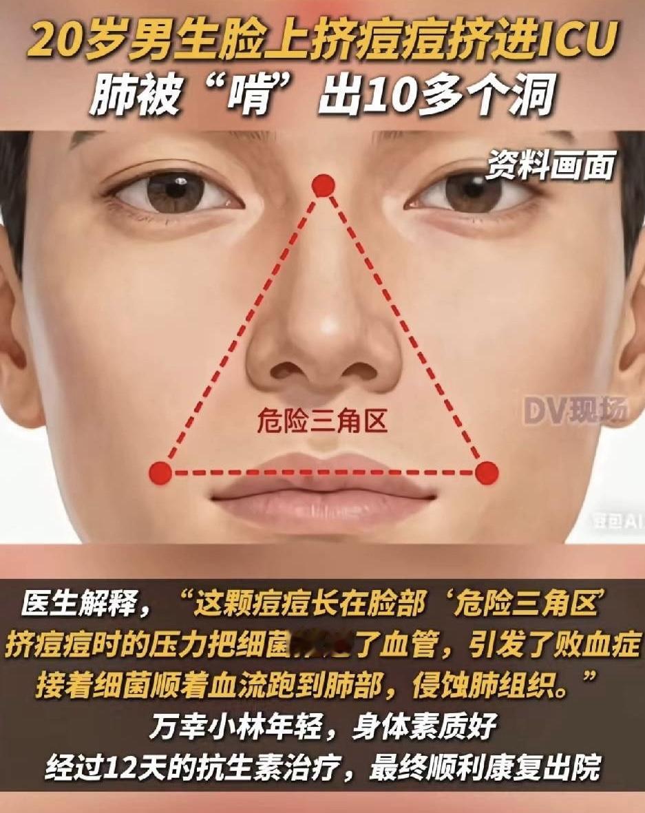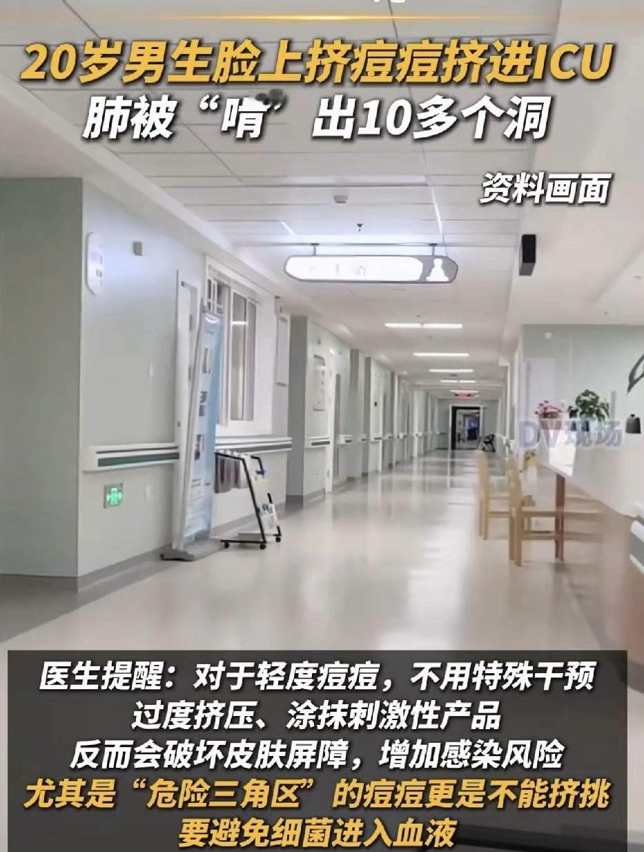 20岁男子挤痘痘挤进ICU肺被“啃”出10多个洞,这事儿听起来太吓人了。男生小林是大二学生,为备考熬夜后脸上冒了颗黄豆大痘痘,没洗手就挤了。 结果呢?小林没想到,这一时的“解气”竟引发了生命中最令人心碎的场景。挤完痘痘后,他的脸部开始肿胀、发红,随即高烧不退。医生诊断显示,他的肺部已经被“啃”出了十多个洞!这不是电影里的惊悚场景,而是真实发生在一个年轻生命上的惨痛教训。 你是否曾经也觉得,挤痘痘只是小事?觉得“忍忍就过去了”,没有想到,轻率的一次行为,竟能让生命悬于一线?这背后隐藏的,是我们对健康的漠视,还是对细节的忽略? 更令人心碎的是,小林的父母、朋友都在为他焦急等待,曾经的青春年华,竟因一颗痘痘变得如此脆弱。这让我们不得不反思:在追求“美丽”的同时,是否也应该多一份对健康的尊重和警惕? 或许,我们都需要从这场“痘痘危机”中汲取教训:别让一时的疏忽,成为生命的隐形杀手。每一次看似微不足道的行为,都可能埋下危险的种子。生命,只有一次,别让“轻率”成为永远的遗憾。什么是面部危险三角区?