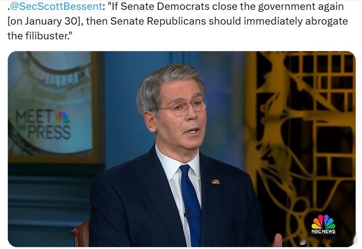 美国财长贝森特:“如果参议院民左党人在1月30日再次让政府关门,那么参议院共和党人就应该立即废除阻挠议事规则(filibuster)。”