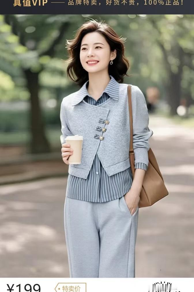 清新淡雅的蓝白条纹套装,搭配咖啡色手提包,轻松演绎都市时尚!