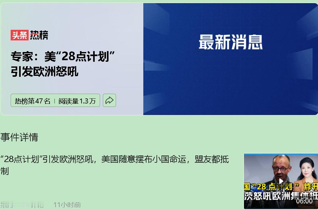 当盟友不再与你商量,而是递来一份既成事实的“和平方案”,你会怎么做?乌克兰正面临这样的处境。 特朗普政府抛出28点计划,要求乌放弃部分领土、限制军队、不加入北约——而欧洲盟友,竟是从新闻里才得知内容。 欧洲也破防了。这哪是合作?分明是通知。 于是G20会场一角,多国领导人紧急碰头。他们不直接反对,只说“方案还要再谈”。英国首相斯塔默更硬气:“停火不能以牺牲乌克兰自卫能力为代价。” 可乌克兰呢?泽连斯基的讲话透出无力:“要么失去尊严,要么失去伙伴。”他们派出了谈判团队,但谁都明白——弱势一方,哪有太多选择。 战争打到最后,往往是谈判桌定结局。此刻的基辅,资源见底、兵力疲惫,而大国已开始布局“后战争格局”。 有人说,这就是现实政治。可我们忍不住想:如果每个国家的声音都能被真正倾听,会不会有不一样的和平? 国际格局悄然生变,而小国的命运,又一次被推上牌桌。