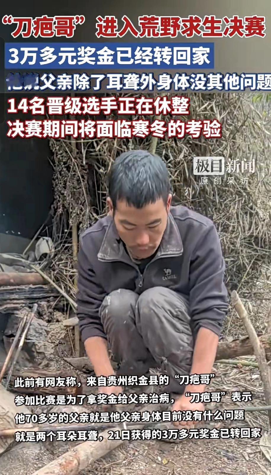 励志!“刀疤哥”闯到荒野求生决赛,3万奖金先转回家:“爸,等我拿冠军给你买新助听器” 荒野求生决赛现场,皮肤黝黑的“刀疤哥”正蹲在溪边烤鱼,左脸颊一道浅浅的疤痕在火光下格外明显。镜头扫到他时,他正对着卫星电话大声喊:“爸!我进决赛了,赢的3万奖金先给你转回去了,你先用着!” 刀疤哥本名叫陈强,来自山区,脸上的疤是小时候帮家里干农活被树枝划的。这次参加荒野求生,他从初赛就靠“狠劲”出圈:别人嫌蚯蚓恶心,他抓来串成串当鱼饵;暴雨天别人躲山洞,他冒雨找野果,说“饿肚子比淋雨难受”。 提到父亲,他眼里软了下来:“我爸耳朵聋了快十年,打电话得对着他耳朵喊。但他身体硬朗,每天还去地里干活,总说‘别担心家里’。”这次比赛奖金,他早计划好了:“先给爸换个好点的助听器,剩下的攒着修修家里的老屋。” 队友说,刀疤哥在野外总背着个旧布袋,里面装着父亲种的干辣椒,“他说想家了就闻闻,立马有劲儿了”。决赛前一晚,他在帐篷里用树枝在地上画老家的房子,“等比完赛就回家,陪我爸多待几天”。 网友看了纷纷点赞: “这才是真汉子,有拼劲更有孝心” “疤痕下藏着的是担当,比多少滤镜都帅” “祝他拿冠军!让大爷早点用上新助听器” 其实生活里的“刀疤哥”还有很多:他们或许平凡,甚至带着点“粗糙”,但心里装着家人,肩上扛着责任,每一步都走得踏实。就像他说的:“荒野再难,也难不过想让家人过得好一点的决心。” 你觉得“刀疤哥”能夺冠吗?评论区为他加个油~
