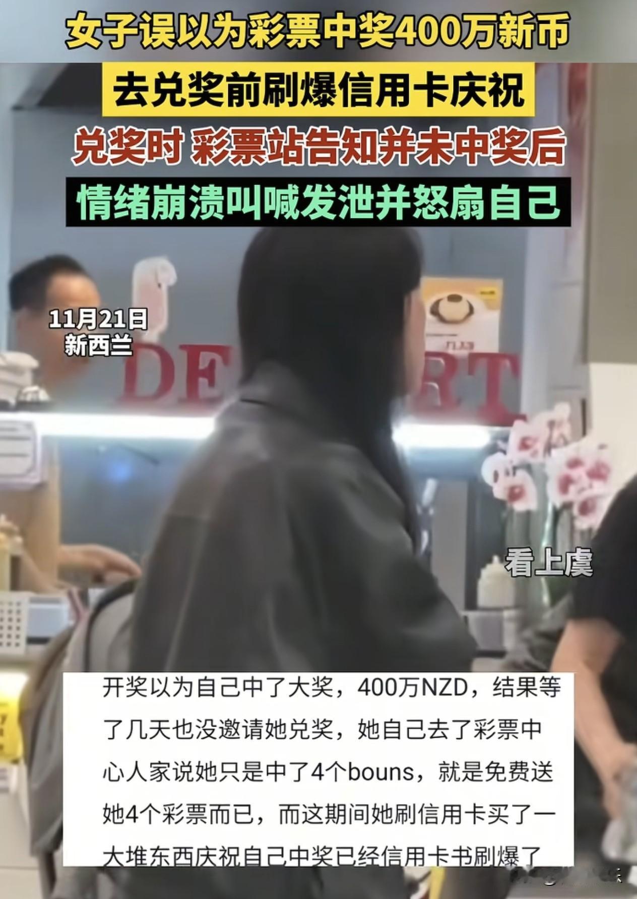 女子误以为彩票中奖400万新元,兑奖前疯狂刷信用卡,结果悲剧了 做梦中彩票的事咱们都幻想过,可美国密歇根州有位大姐把这梦做早了——奖金还没到手,她就忍不住刷爆信用卡疯狂消费,结果美梦秒变噩梦。 事情是这样的,底特律一位女士某天核对彩票号码,越看越激动,坚信自己中了400万新元大奖。她二话不说,立马开始盘算怎么花这笔“天降横财”,顺手就抄起信用卡开启“买买买”模式。 她压根没去想“万一没中怎么办”,刷卡一时爽,账单火葬场。 这位不愿公开姓名的女士,兴冲冲拿着彩票去兑奖,却等来了让她心碎的消息——工作人员告诉她,她根本没中那400万。 不是号码看岔了,就是规则理解错了。总之,她幻想中的巨额奖金,眨眼间烟消云散。 美梦惊醒后,现实扑面而来。信用卡账单一张接一张,可她早已透支干净,哪还有钱还? 银行可不会买账,“我以为我中奖了”这种理由,在还款提醒面前苍白无力。 她不仅要还清刷掉的本金,还得面对高额的逾期利息和违约金。按照规定,信用卡逾期利息通常是未还金额的每日万分之五,违约金则是未还最低还款额部分的5%。 这些层层叠加的费用,就像雪球一样越滚越大,把她推进更深的债务坑里。 更糟的是,一旦逾期不还,她的个人信用记录就会彻底“花掉”。 这意味着她以后想贷款、办卡,甚至租房、找工作,都可能处处碰壁。而信用的修复,可不是一两个月的事,往往需要好几年。 如果她一直拖着不还,银行很可能采取法律手段追债。 要是被认定是故意透支、恶意不还,那事情就大了,甚至可能要吃上官司。 其实像她这样一时冲动、提前“庆功”的人还真不少。不过也有人是真走运——就在不久前,密歇根州韦恩县一名33岁男子,在加油站随手买了张别人挑剩的刮刮乐,居然真刮出了100万美元! 所以说,花钱得踏实,过日子要量力而行。 天上不会天天掉馅饼,但信用卡的账单,可是月月准时来敲门。(图片来自:看上虞)