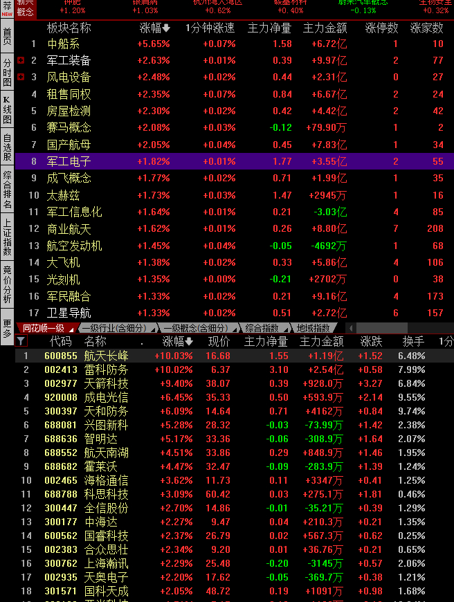 今天是军工系的天下,我很久没找个股操作了,有点找不到感觉,等我全部筛选一遍看看。