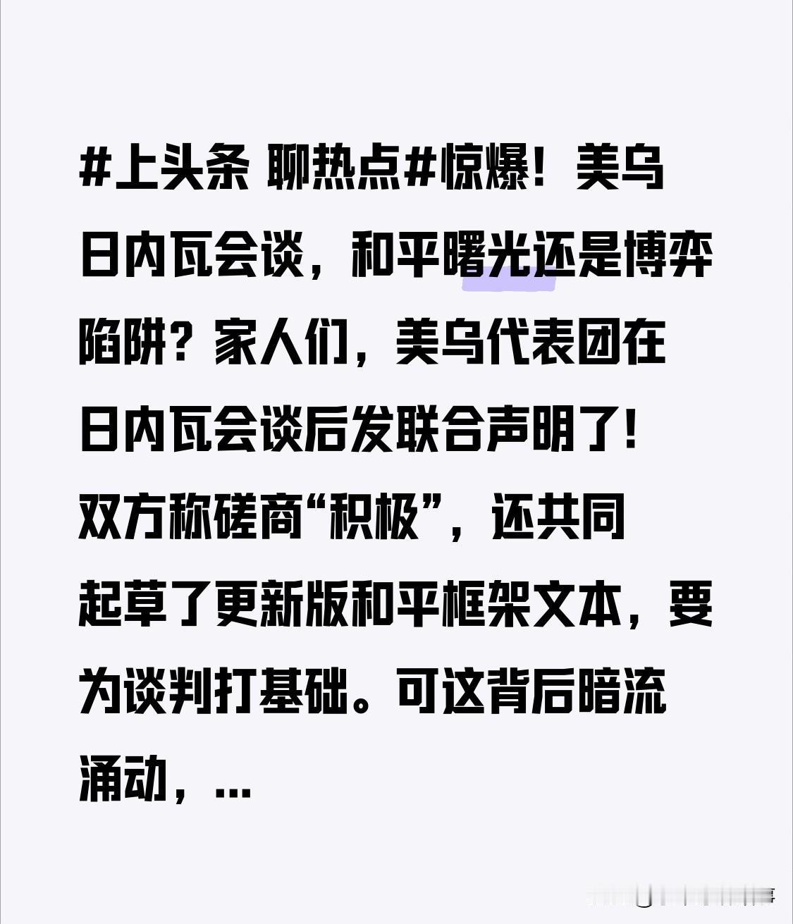 惊爆!美乌日内瓦会谈,和平曙光还是博弈陷阱? 家人们,美乌代表团在日内瓦会谈后发联合声明了!双方称磋商“积极”,还共同起草了更新版和平框架文本,要为谈判打基础。可这背后暗流涌动,美方“28点”计划早惹欧洲不满,财政、领土安排争议不断。乌克兰也面临艰难抉择,泽连斯基盼可靠和平。俄罗斯虽未直接回应,却也释放谈判信号。这看似向和平迈步,实则各方利益博弈激烈,最终能否迎来真正和平,咱且拭目以待!