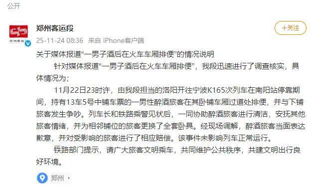 你敢信?火车卧铺过道,竟有醉酒男当众排便!这事就发生在11月22日的K165次列车上,当场引发争吵,整个车厢直接炸锅。 好家伙,这是把公共场合当自家厕所了?铁路工作人员也是拼了——一边清理现场换卧具,一边调解矛盾,最后醉酒乘客道歉加赔偿,才没耽误行车。但这背后的文明隐患,真让人细思极恐。 喝多了不是胡来的借口。想想看,要是没人拦着,万一打起架来,或者引发踩踏,谁负责?列车不是酒吧,管不住自己,就别碰酒。这不是素质问题,这是安全底线! 铁路部门也难。不管吧,其他乘客受罪;管狠吧,又有人说冷漠。这次乘务员反应快、处理稳,值得点赞。可说到底,光靠工作人员不够,关键还得每个人心里有根弦——公共空间不是你一个人的。 其实咱们都知道,规则不是用来束缚谁的,而是保护每个人的。你的自由,不能踩在别人权利上。 下次出门前默念三遍:文明出行,从我做起。别等“社死”了才后悔,那会儿可晚了! 这事看似奇葩,却像一面镜子:你什么样,公共空间就什么样。管住自己,尊重别人,这个世界才会少点荒唐,多些舒心。