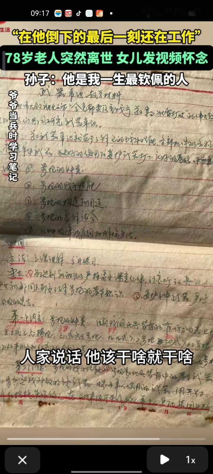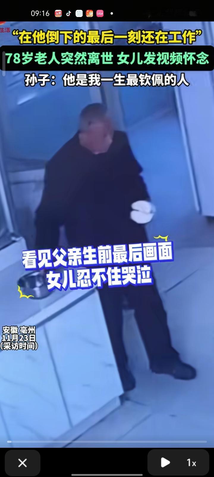 11月23日,亳州市利辛县。78岁老人突然离世,女儿发视频怀念,老人倒下的那一刻还在工作。 老人孙子杨先生称,发现的时候老人已经躺在地上,头上流点血,猜测是心梗发作。老人生前在养老院工作,退休后养老院返聘他了,他一辈子都在为党工作,平时生活很低调,热闹的地方他也不喜欢去,他是一生最钦佩的人