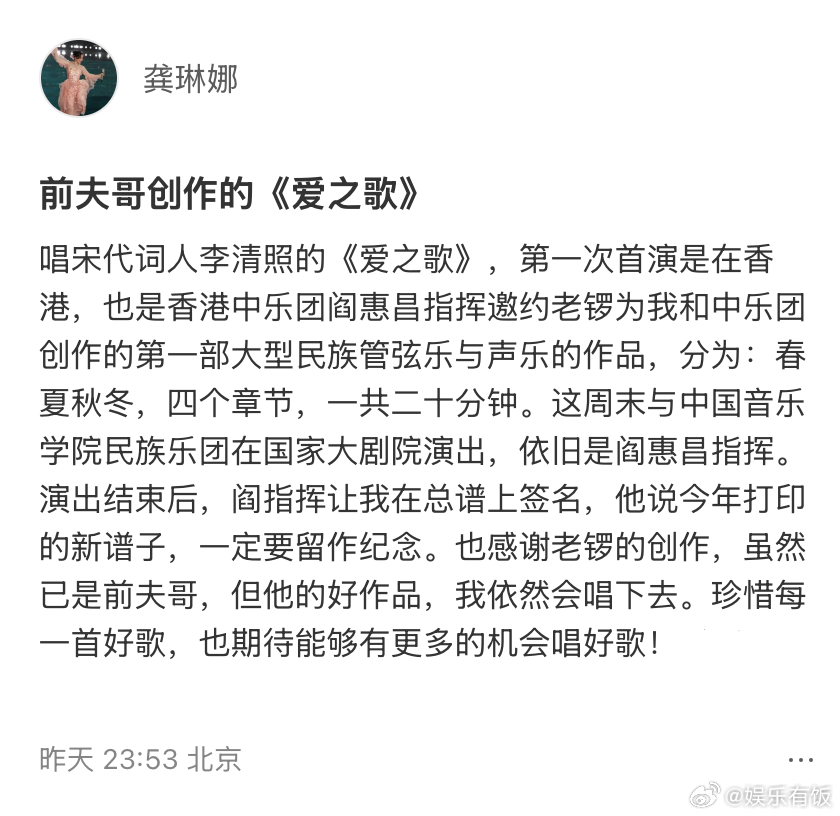 龚琳娜发文分享前夫老锣创作的《爱之歌》演出动态,称该作品是香港中乐团阎惠昌指挥邀约老锣为其和中乐团创作的第一部大型民族管弦乐与声乐作品,分春夏秋冬四章节共二十分钟。她还表示,虽老锣已是 “前夫哥”,但好作品仍会继续演唱,珍惜每一首好歌,期待更多唱好歌的机会。