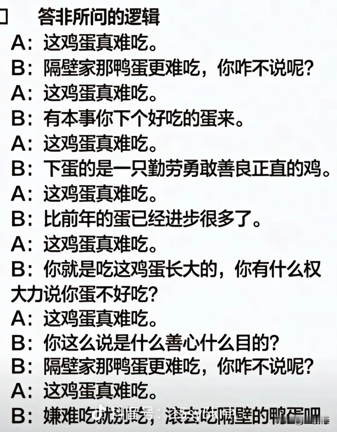 把辩证法思维用到出神入化,别人不开眼,抱怨提意见怎么回答? A:这鸡蛋真难吃。 B:隔壁家那鸭蛋更难吃,你咋不说呢? A:这鸡蛋真难吃。 B:有本事,你下个好吃的蛋来。 A:这鸡蛋真难吃。 B:下蛋的可是一只勤劳勇敢善良正直的鸡。 A:这鸡蛋真难吃。 B:比前年的蛋已经进步很多了。 A:这鸡蛋真难吃。 B:你就是吃这鸡蛋长大的,你有什么权大力说你蛋不好吃? A:这鸡蛋真难吃。 B:你这么说是什么良心?什么目的? B:隔壁家那鸭蛋更难吃,你咋不说呢? A:这鸡蛋真难吃。 B:嫌难吃就引艺,滚去吃隔壁的鸭蛋吧。 我只演示一遍,看清楚了吧。 学会这招,喷子的一切矛盾都能应付自如。用哲学看问题 矛盾辩证法 庸俗辩证法