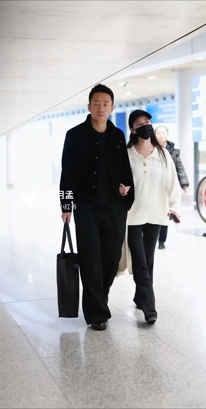 董璇和张维伊在机场等车,手就牵上了,俩人还都穿黑外套,行李放一堆,像约好一起出门
