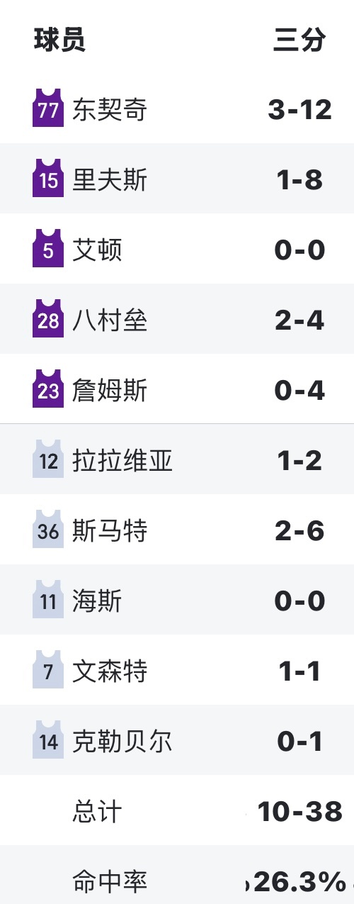 湖人今天三分命中率26.3%,赛季至今第三低。