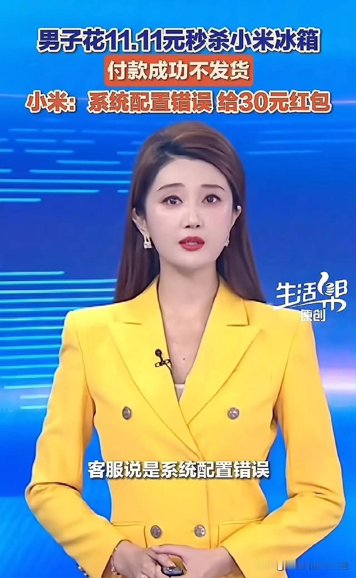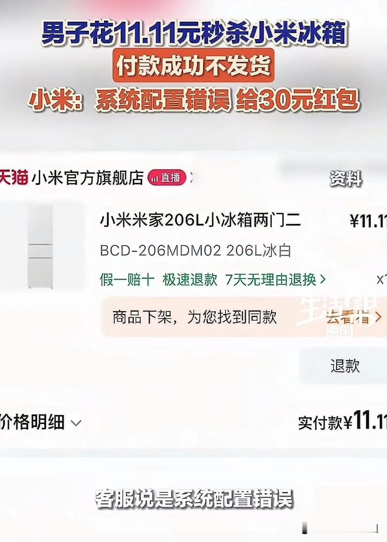 毫无契约精神!”河南,男子花 11.11 元秒杀小米冰箱,付款成功后不发货。店铺:系统配置错误,给你 30 元红包!男子:把我当要饭的? 张先生攥着手机,盯着小米旗舰店客服发来的“30元补偿红包”,气得直拍桌子! 双十一当天,张先生刷到小米旗舰店推出的冰箱11.11 元的秒杀活动。他抢了好几天,还特意关掉WiFi用流量刷,好不容易才下单付款成功。结果等来的不是发货通知,而是一条冰冷的短信,说因为“系统配置错误”订单无法发出,让他取消订单,店家补偿30元红包了事。张先生觉得这简直是在戏弄人,他明确表示不要补偿,只要冰箱。平台方面的回应听起来也挺无奈,说按规定卖家该履约,但这么低的成交价,卖家可能宁愿接受处罚也不发货。 “系统配置错误”这个理由,近几年在各种电商价格乌龙事件里都快听出老茧了。商家挂出商品、消费者付款成功,这买卖合同在法律上通常就算成立了。不能总是商家自己出了错,轻轻一句“系统问题”就把约定抹掉,这让消费者怎么敢相信平台的促销活动? 类似的事情之前发生过不少,比如2022年苹果官网价格标错,但京东最后还是选择正常发货,因为他们没有在条款中说明系统出错可以免责。也有法律从业者指出,若确属系统配置错误导致商品价格设置异常,只要消费者成功下单并完成支付,合同即告成立,商家应依约履行发货义务。 当然,11.11元买一台市价几百上千元的冰箱,这价格确实低得离谱,明显超出正常促销范围。很多人会觉得消费者在“薅羊毛”。但问题的关键或许在于,平台和商家在策划这种极限秒杀活动时,有没有更严谨的风控机制?比如设置价格异常自动预警,或者明确活动规则和可能的补救措施。不能总等到消费者付出时间精力抢购后,才用“失误”来搪塞,这很伤信誉。 各位读者你们怎么看?欢迎在评论区讨论。