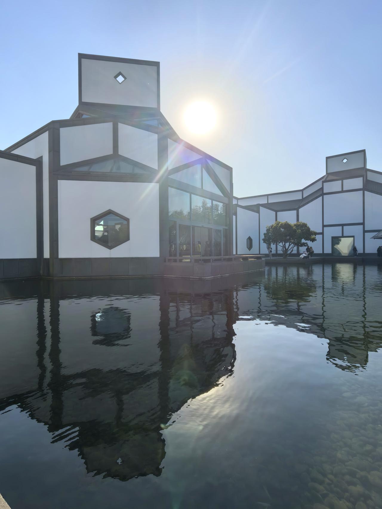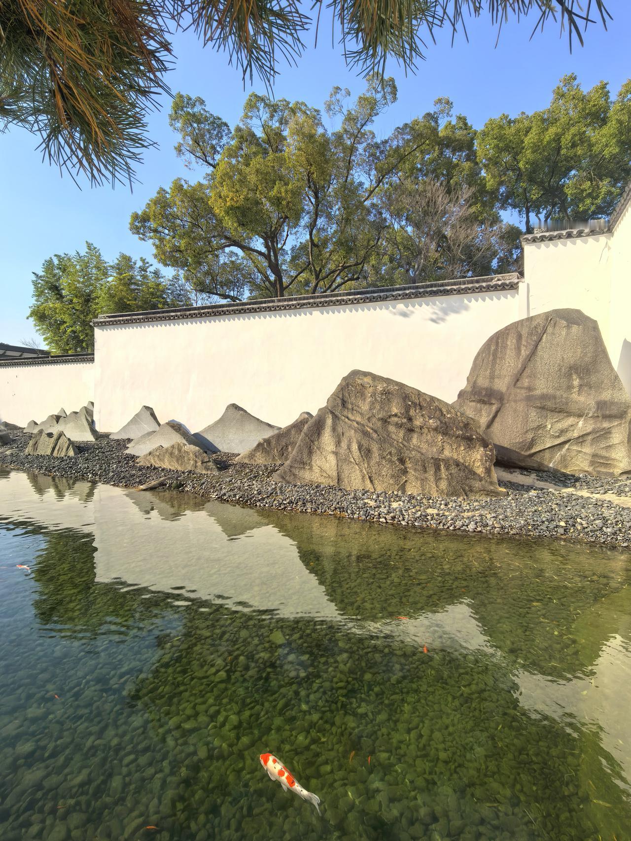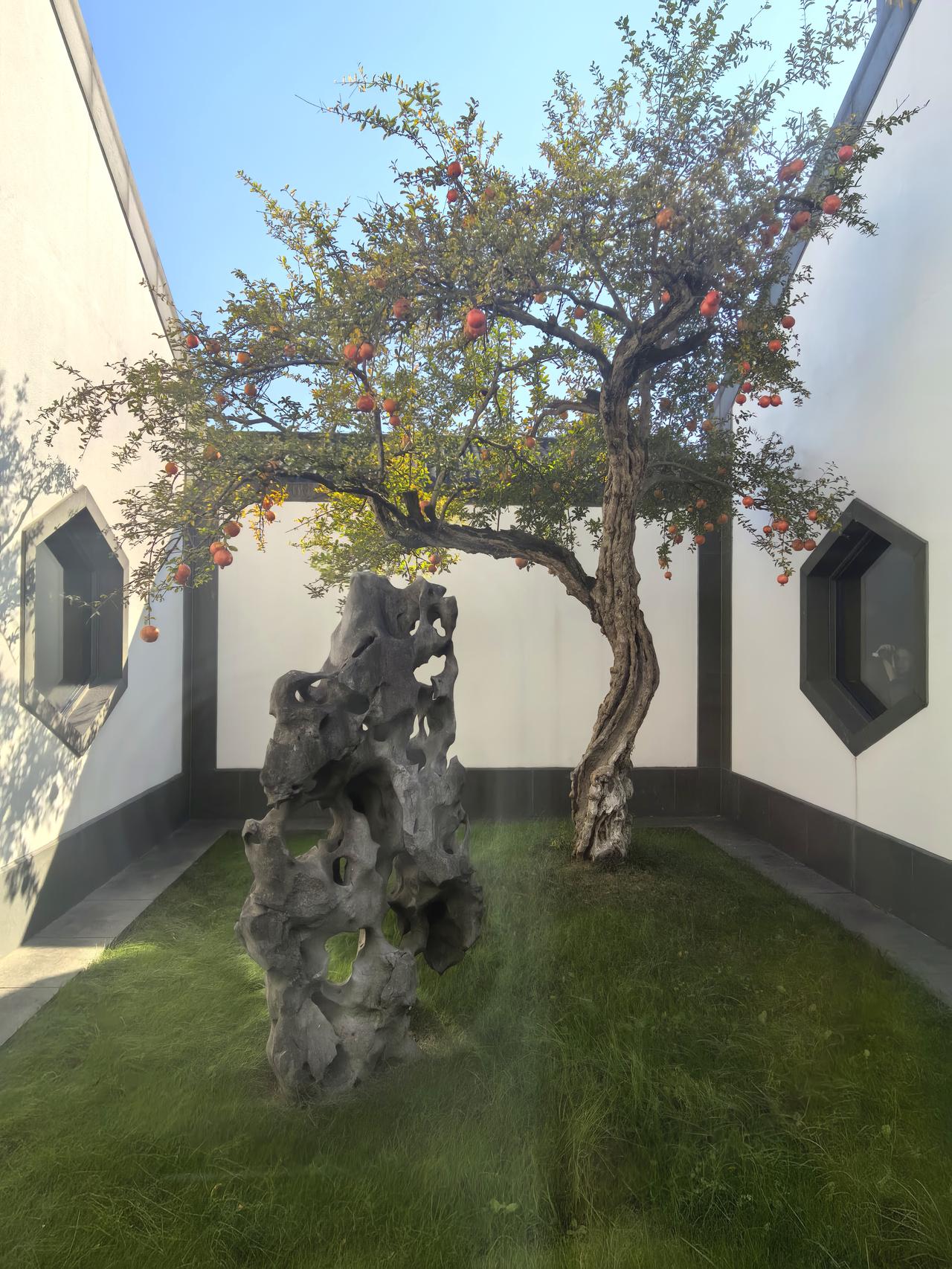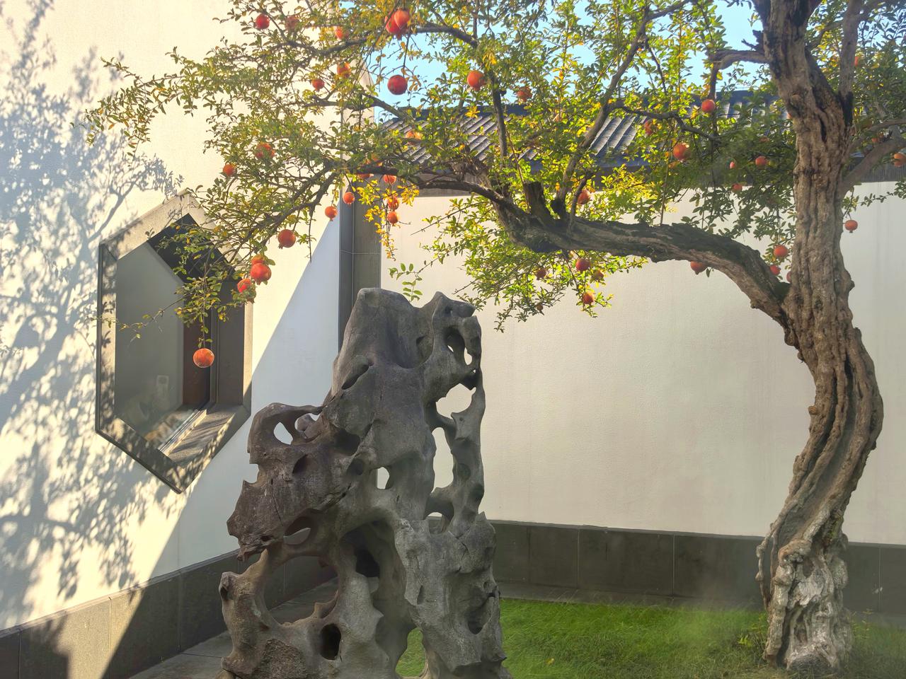 苏博光影里,珍宝与榴红共醉。。 从拙政园的曲廊水榭中抽身,脚步未及远,便撞进了苏州博物馆的清雅天地——这方与拙政园仅一墙之隔的院落,是贝聿铭先生以光影为笔、以山水为墨的收官之作,白墙黛瓦间藏着江南的灵秀,也沉睡着时光淬炼的珍宝。 本次苏州之行的第八站便是苏博寻宝。踏入展厅,目光率先被真珠舍利宝幢攫住。这尊北宋年间的珍品,高122.6厘米,通体以珍珠、玛瑙、琥珀等奇珍异宝缀成,幢顶的鎏金火焰宝珠熠熠生辉,幢身的银质龙纹栩栩如生,每一片珍珠缀成的帘幕都轻垂如瀑,细细看去,甚至能在镂空的银质构件上寻到细密的缠枝莲纹。最令人惊叹的是幢内供奉的舍利子,被层层宝器簇拥,在灯光下流转着温润的光,仿佛将千年的虔诚与匠心都凝于一瞬,静静诉说着宋代工艺的巅峰水准。 转身间,越窑秘色瓷莲花碗在展柜中静静伫立。碗身呈莲瓣形,浅腹平底,外层的莲瓣舒展自然,内层的莲瓣紧凑圆润,通体施青釉,釉色如雨后远山,温润通透,釉面细腻得仿佛玉石般莹润。秘色瓷曾是皇家专属,"九秋风露越窑开,夺得千峰翠色来",这首诗道尽了它的珍贵——釉色中藏着千峰叠翠的江南意境,胎质轻薄却不失沉稳,捧在手中(虽仅能远观),竟似能触到千年之前的窑火温度,感受那份独属于吴越的清雅风骨。 兵器展区内,吴王光剑正散发着穿越千年的凛然锋芒。这柄春秋晚期的青铜剑,是吴王阖闾(名光)的自用佩剑,剑身修长挺拔,通长77.3厘米,剑格饰有精美的兽面纹,剑首以同心圆纹环绕,纹路细密规整,尽显王室仪仗的威严。剑身通体布满菱形暗格纹,历经两千余年依然寒光凛冽、刃口锋利,靠近展柜细看,剑身上"攻吴王光自作用剑"的八字鸟虫书铭文清晰可辨,笔势灵动苍劲,既是权力的象征,更藏着春秋时期吴越铸剑工艺的巅峰密码——青铜的坚韧与纹饰的精巧相融,仿佛能想见当年剑指江山的雄姿,让江南的温婉里,多了几分铁血丹心的厚重。 走出展厅,阳光透过贝聿铭先生设计的几何形漏窗,在青砖地面上投下斑驳的光影。转角处,一株石榴树悄然伫立,枝桠斜斜探过白墙,沉甸甸的石榴果挂满枝头,像一串串燃烧的小灯笼,红得热烈而鲜活。阳光穿过石榴叶的缝隙,在红果上投下细碎的光斑,光影与红榴相映,恰好落在旁边的片石假山旁——灰白的石头、朱红的榴果、澄澈的光影,构成了一幅天然的江南小品,比画卷更灵动,比珍宝更鲜活。 驻足良久,看风动榴叶,光影流转,忽然懂得苏博的妙处:它既有千年珍宝的厚重,藏着江南的历史与匠心;又有草木光影的灵动,透着江南的烟火与诗意。这一墙之隔,从拙政园的古典园林到苏博的现代雅致,从自然山水到人文瑰宝,苏州的韵味,便在这一步一景中,深深印刻在心底。原创作品 走进苏州博物馆 随手拍苏州博物馆 参观苏博镇馆之宝 苏博网红石榴树