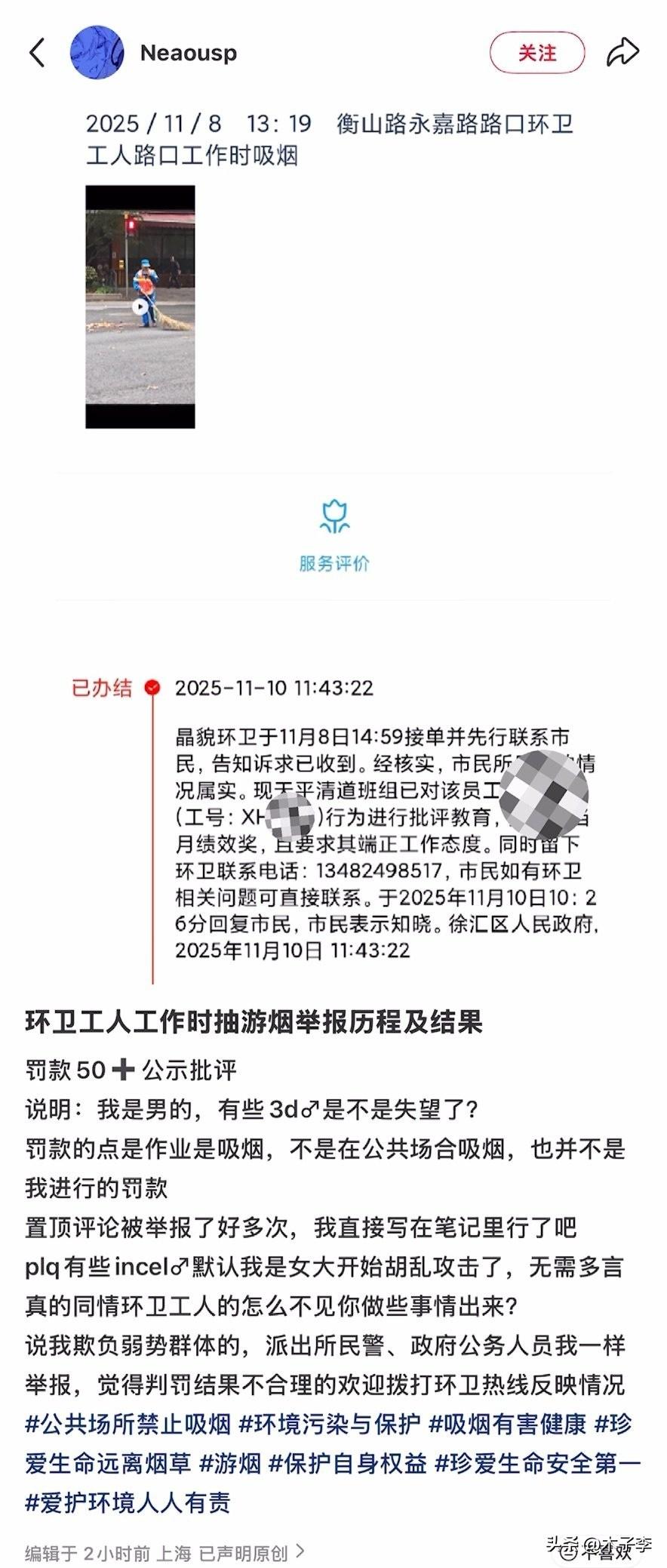 网友投稿,小红书上一博主称投诉上海徐汇区一环卫工人工作时抽烟,使该环卫工受到罚款 50 元和公示批评的处罚。 该博主行为导致争议,有网友为其叫好,也有不少人质疑其只会欺负环卫工人。 虽然该博主自称男的,但是根据该博主过往帖子内容,疑似是女高中生,之前分享的内容多是看演唱会,日式料理,各种点心等。