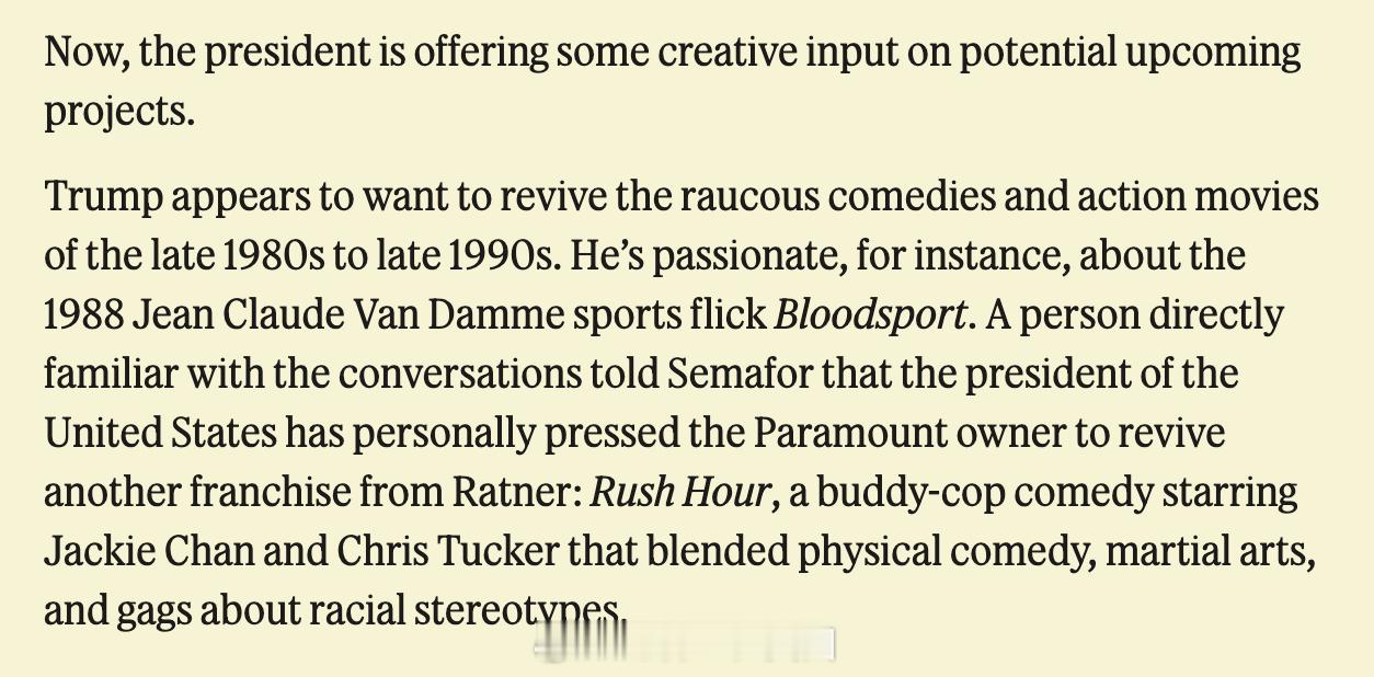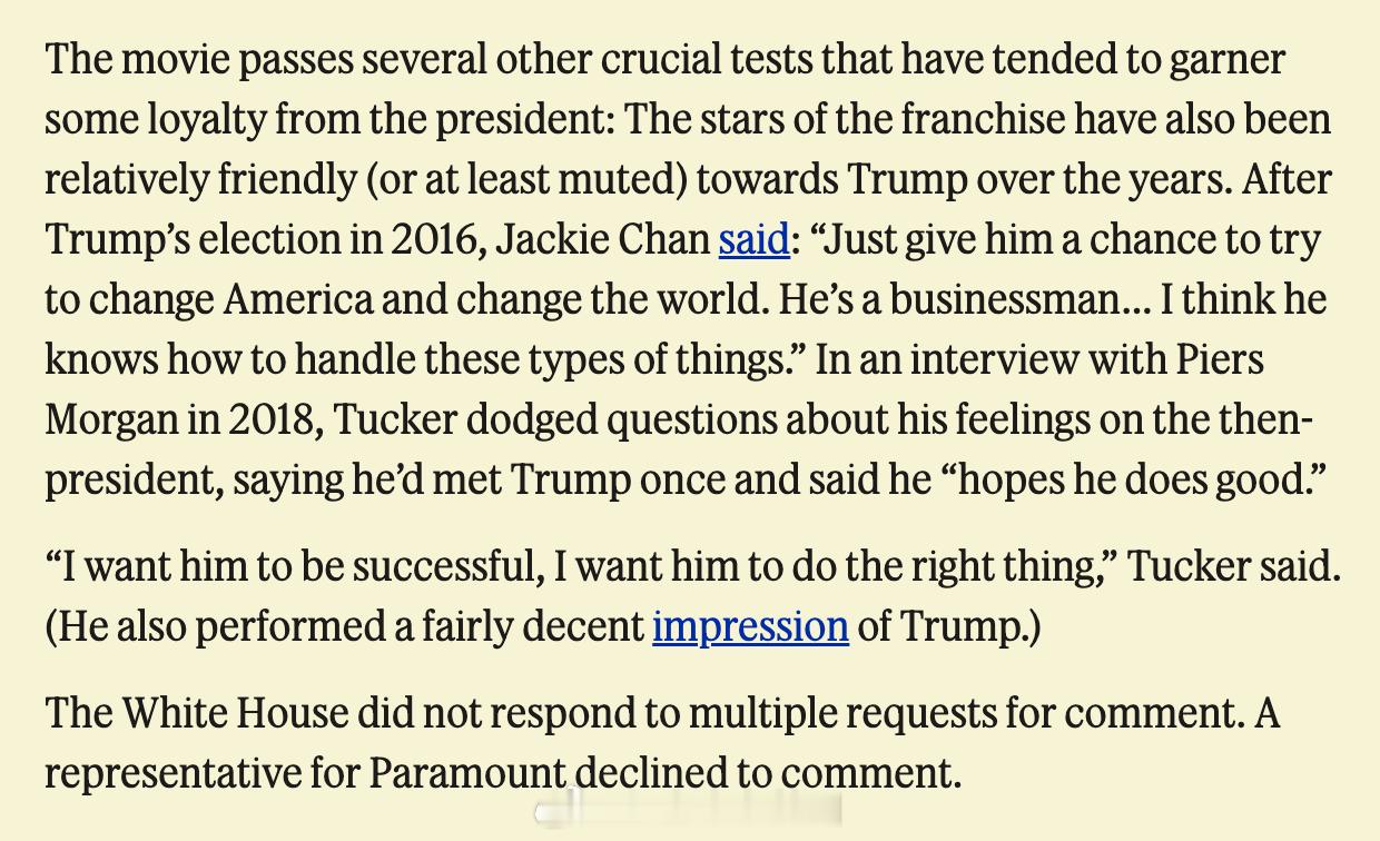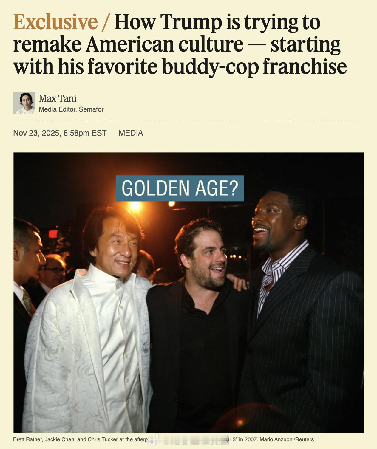 川普亲自向大金主,现在派拉蒙Paramount的实际掌控人,科技大佬Larry Ellison施压,要求他重启Brett Ratner执导的系列电影。川普非常喜爱8、90 年代那种喧闹的喜剧和动作片,他希望看到那种充满传统男性气概、动作场面以及带有种族刻板印象笑料的电影回归。而这部电影也符合川普想要推广的“反政治正确”文化标准:首先导演Brett Ratner曾因性骚扰指控被好莱坞“取消”,而他现在已进入川普的圈子,比如为Melania拍摄纪录片。另外主演成龙和Chris Tucker多年来对川普的态度相对友好或温和。2016年川普当选后,成龙说过:“就给他个机会,让他试着改变美国、改变世界。他是个商人……我觉得他知道怎么处理这种事。” Tucker在2018年接受采访时说自己见过川普一次,并表示:“我希望他成功,也希望他能做正确的事。”