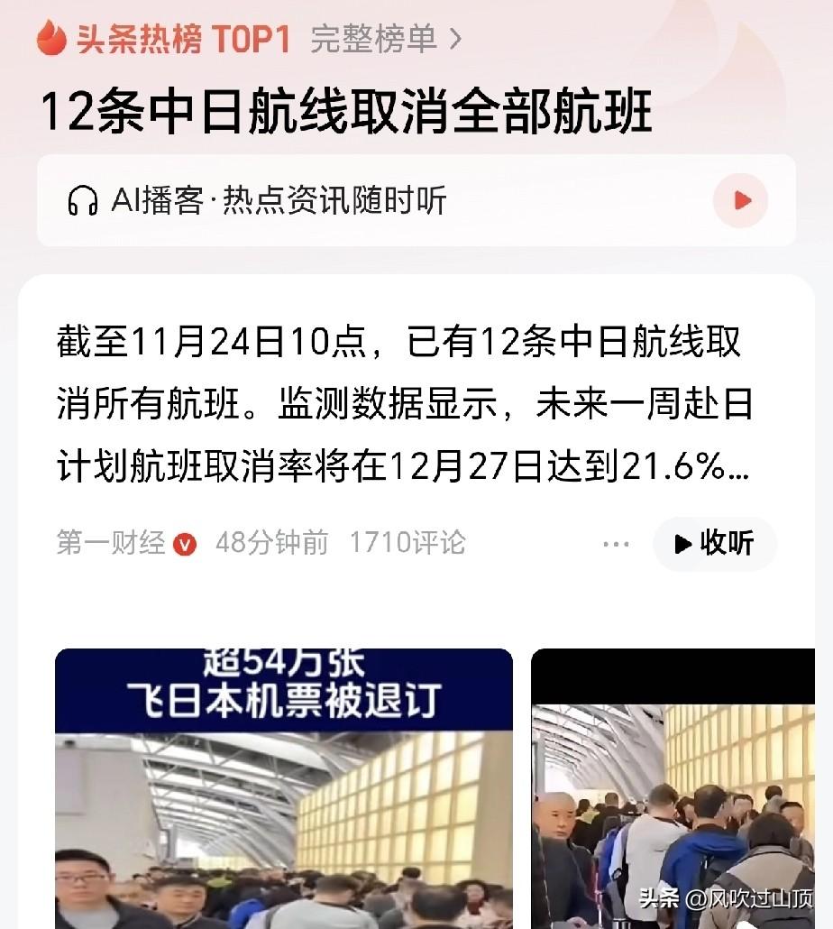 突发新闻 12条中日航线 全部取消(无一例外) 航线断、客源减,大批滞留日本的国人挤爆回国机场,市场情绪迅速传导至日本股市,日经指数应声大跌。 谁说只有炮火才是动真格?经济战已起,眼下,日本只有一条路可走。