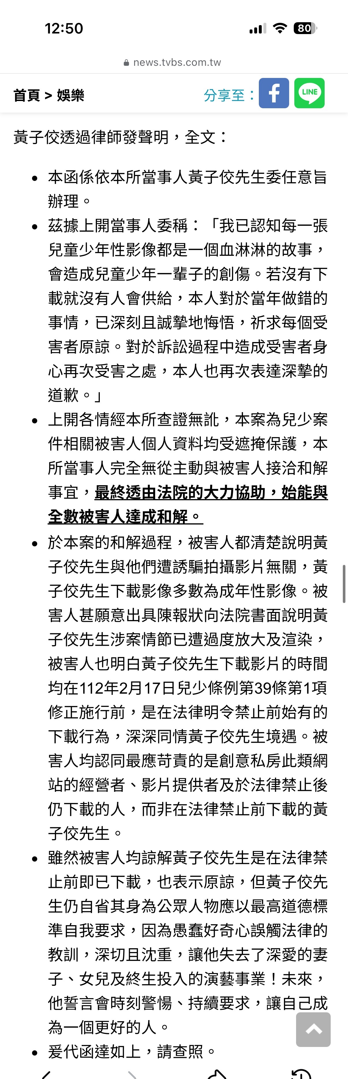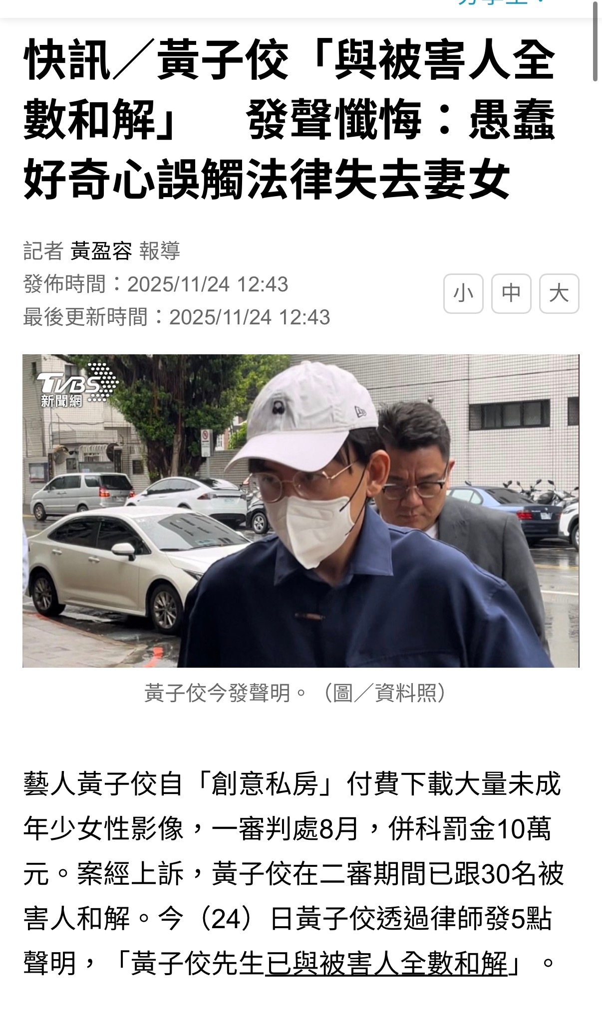 黄子佼与被害人全数和解。。。。。。。。。。。。。透過律師發聲明道歉:本人对于当年做错的事情,已深刻且诚挚地悔悟,祈求每个受害者原谅。对于诉讼过程中造成受害者身心再次受害之处,本人也再次表达深挚的道歉。