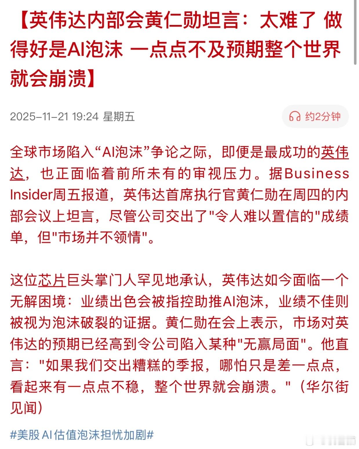 英伟达如今的烦恼:业绩好,被说是泡沫;业绩稍微低于预期,全世界都会崩溃