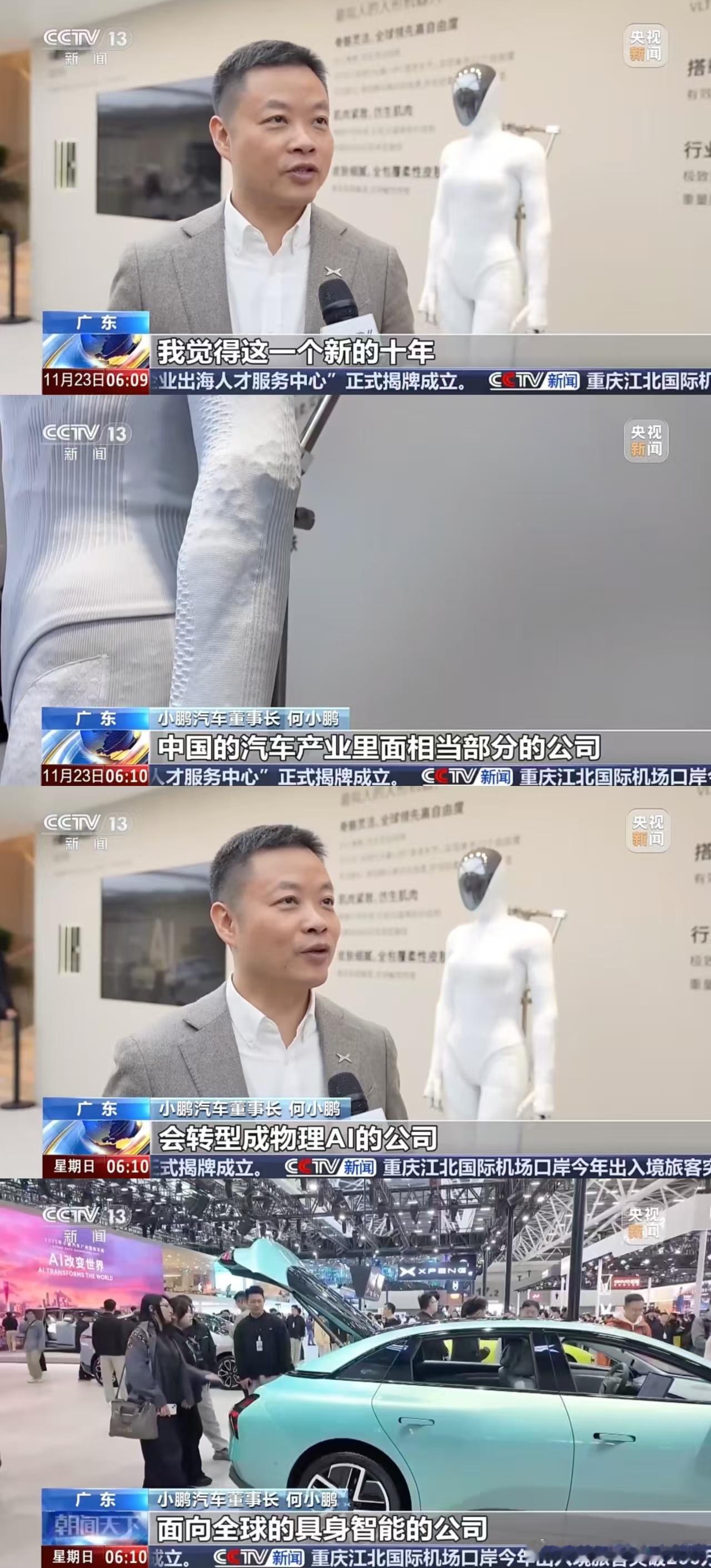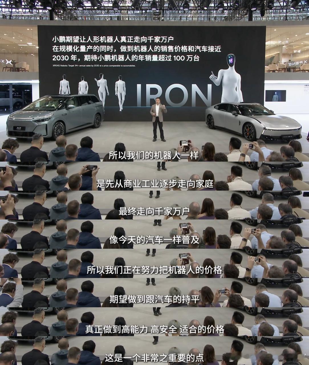 2025广州车展第三日,小鹏汽车展台的“剪腿版”机器人IRON持续圈粉,成为展区人气顶流,吸引大量观众驻足拍照互动。小鹏汽车董事长兼CEO何小鹏在发布会中分享了机器人的商业化路径的思考,指出人形机器人将“先从商用、工业场景起步,逐步进入家庭,最终走向千家万户,像汽车一样普及”。他明确表示,小鹏正致力于将机器人价格做到在“与汽车同级”,并期望在2030年实现年销量百万台。这一跨界布局也获央视《朝闻天下》栏目关注。报道指出,车企进军机器人是汽车产业向“新质生产力”跃迁的生动缩影。何小鹏在采访中也进一步表示:“新的十年,中国汽车产业中相当一部分公司将转型为物理AI企业,成为面向全球的具身智能公司。”