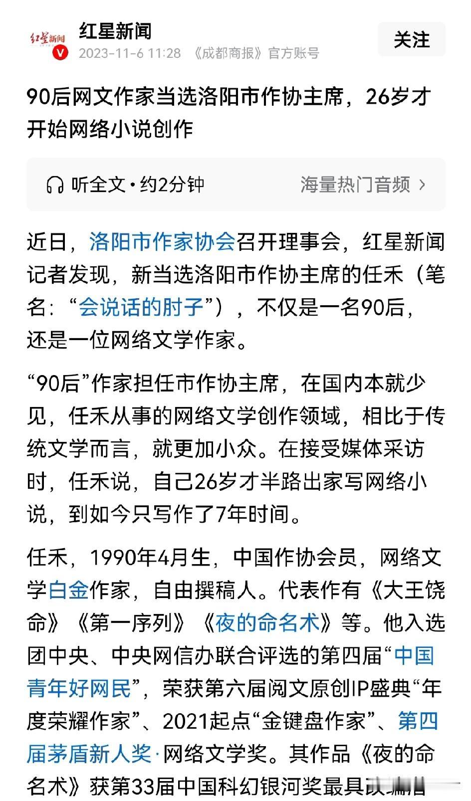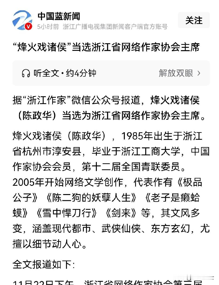 “烽火戏诸侯”当选浙江省网络作协主席,我记得前两年“会说话的肘子”也当选了洛阳市作协主席,现在看来受伤的只有中原五百了,这五个人在网文的白银和黄金时代是叱咤风云,赚的盆满钵满,更是作家富豪榜上的常客,可惜地位却逐渐跟不上了。
