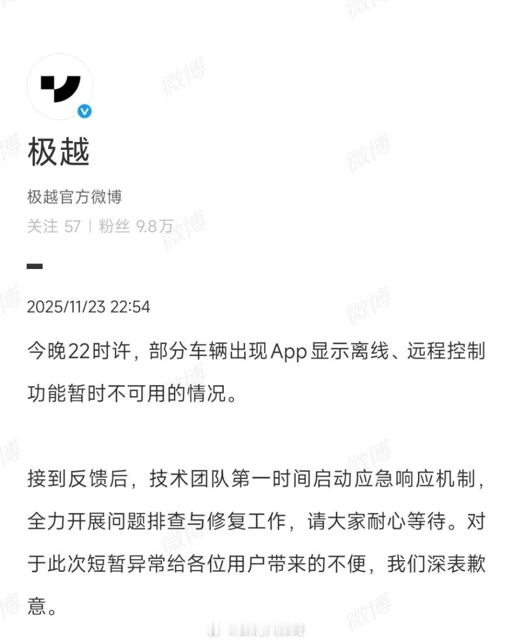 昨日22时许,极越汽车官方App出现短暂技术故障,导致部分用户车辆显示离线,远程控制功能受限。极越汽车方面表示,公司已第一时间启动应急预案,技术团队迅速介入排查并修复服务。此次故障对用户造成的不便,官方深表歉意。