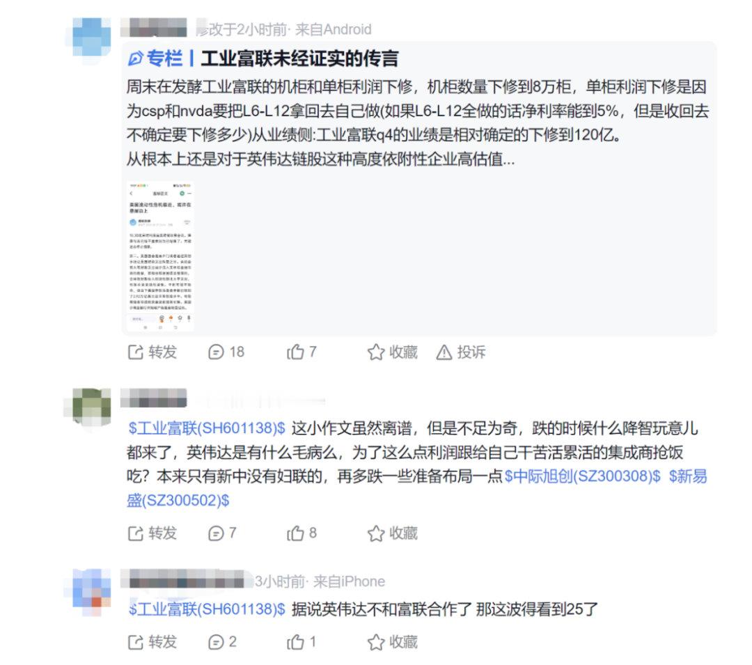 【?】 11月24日,万亿市值巨头工业富联股价遭遇重挫,盘中一度触及54.6元/股的跌停价。 截至24日收盘,工业富联报55.94元/股,跌7.80%,成交额达187.24亿元,总市值为1.1万亿元。近两个交易日,工业富联累计跌幅超15%,股价创下近2个月以来新低。工业富联股价的异常波动,或与坊间的“小作文”有关。据近日网上传闻,工业富联的AI服务器机柜出货量和单柜利润面临下修。其中,机柜数量被下调至8万柜,而单柜利润下滑则源于云服务提供商和英伟达欲将服务器产业链中利润更丰厚的L6-L12层级环节收回自研。 对此,记者向工业富联方面求证,截至发稿公司暂无回应。 此前,工业富联在11月13日举行的业绩说明会上回应称,针对市场上有关“订单或展望下调”的传闻,未发布任何相关口径,现有客户项目进度与交付节奏正常。 但是,相关消息再次发酵,仍然引起诸多投资者的关注和讨论。
