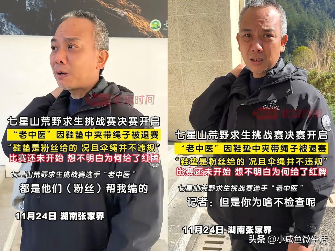 七星山荒野求生决赛才刚开始,老中医就被罚红牌下线了! 开赛前他还狂啃卤牛腱子,谁知道开赛后他就被淘汰了,原因是在赛前检查时,发现他的鞋垫藏有粗线。 网友表示:他这事做得不聪明,这线明明可以缝在鞋垫上,到时候想用了再拆不就好。 记得看贝爷的荒野求生,他也是经常拆自己的包包和降落伞来获取工具。 只能说可惜了,这鞋垫还是粉丝送的,他知道已经来不及了。