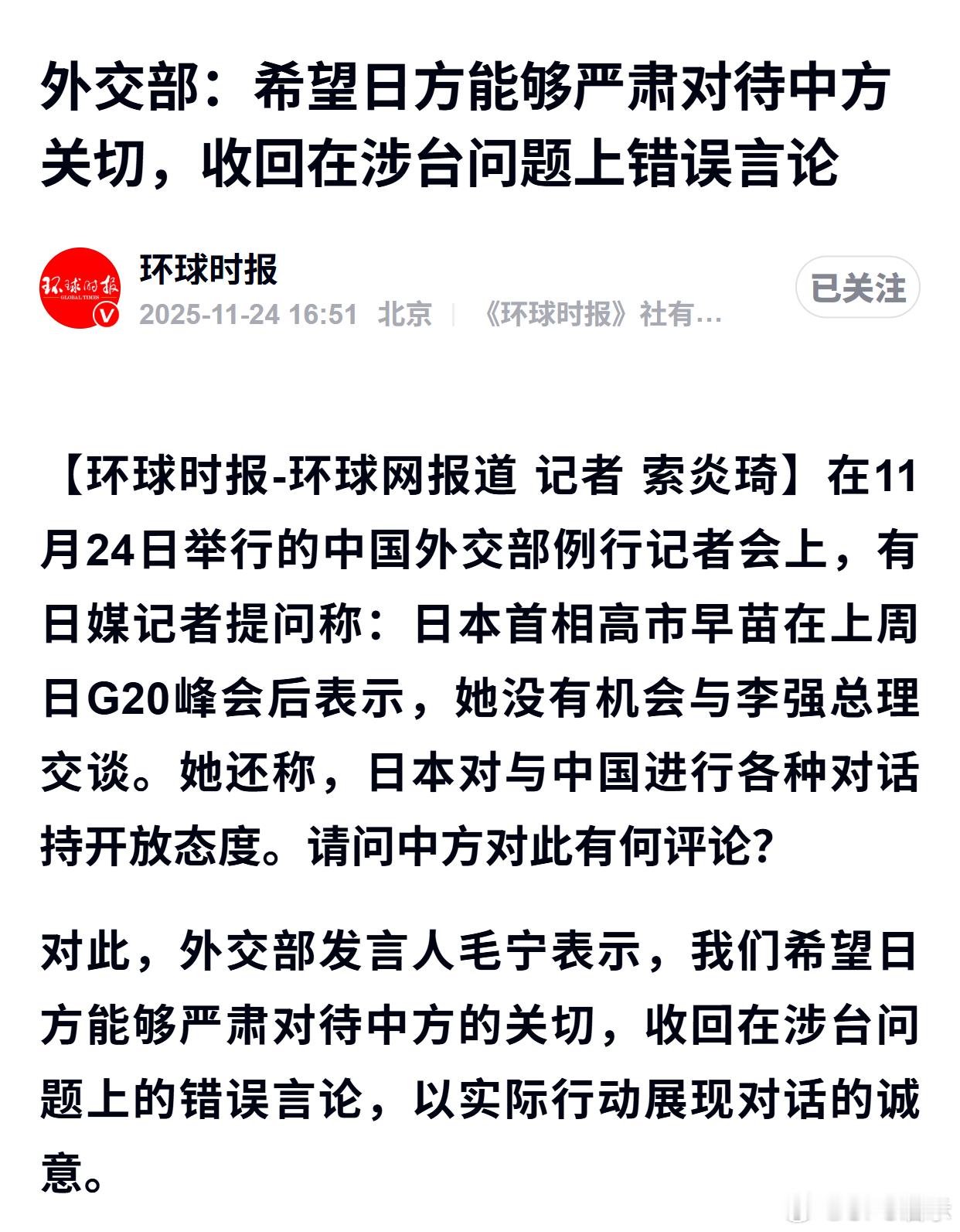 高市早苗称仍愿与中国进行各种形式对话,外交部:望日方展现诚意