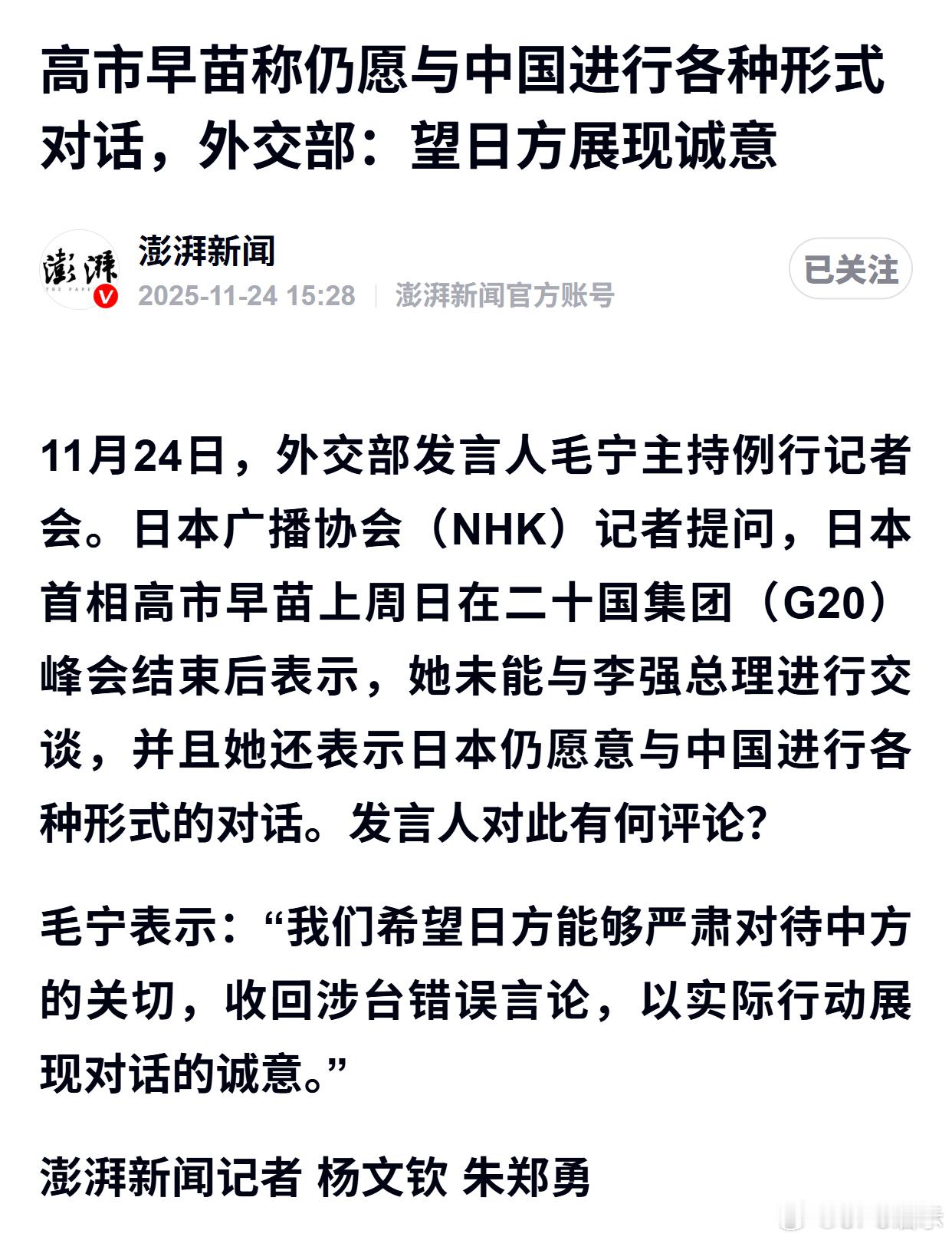 高市早苗称仍愿与中国进行各种形式对话,外交部:望日方展现诚意