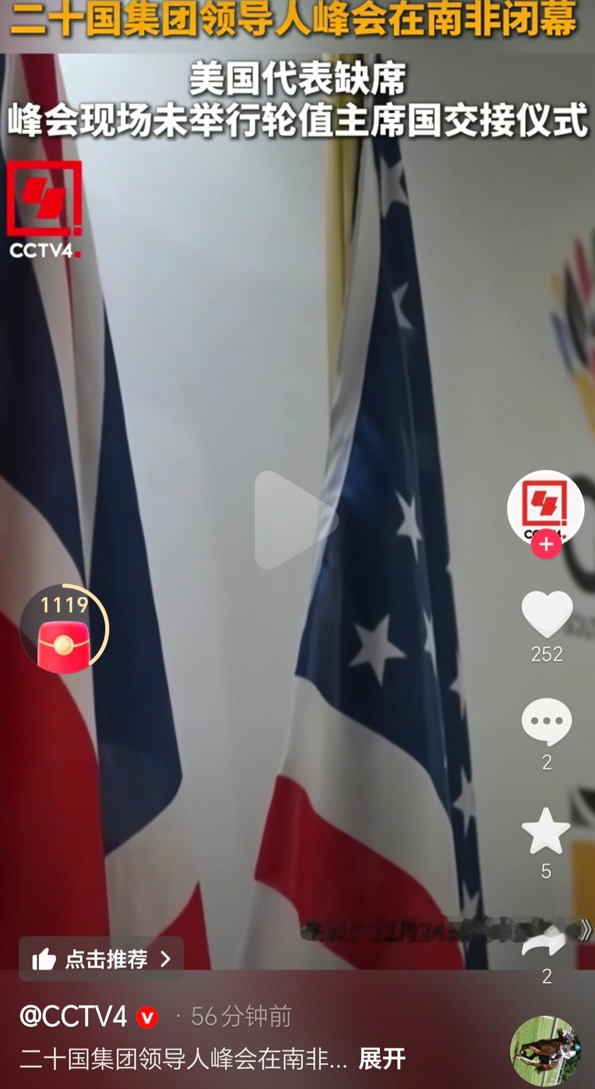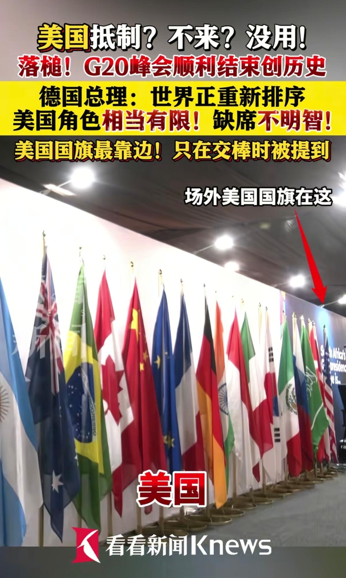 美国国旗放最边缘,交接仪式取消!美国缺席G20峰会,确实相当的不明智。现场本该举行的交接仪式,也没有举行。南非拒绝了美国派大使馆工作人员,参加交接仪式的提议。所以,本届G20峰会,并没有举办交接仪式。 你美国不来,那么主办方也不惯着,就不给你举办交接仪式。就算明年是在美国举办G20,今年也刻意的忽视了美国的存在。这次的会议,很少提及美国,也只在最后交接棒的时候,提到了美国。所以,有没有美国参加,会议照样举办,议题照样讨论。并不会因为美国没参加,地球就不转了。