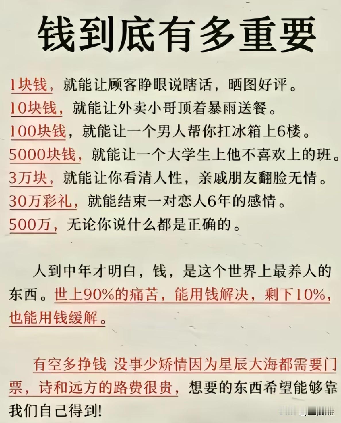 钱到底有多重要? 1块钱,就能让顾客睁眼说瞎话,晒图好评。 10块钱,就能让外卖小哥顶着暴雨送餐。 100块钱,就能让一个男人帮你扛冰箱上6楼。 5000块钱,就能让一个大学生上他不喜欢上的班。 3万块,就能让你看清人性,亲戚朋友翻脸无情。 30万彩礼,就能结束一对恋人6年的感情。 500万,无论你说什么都是正确的。 人到中年才明白,钱,是这个世界上最养人的东西。世上90%的痛苦,能用钱解决,剩下10%,也能用钱缓解。 有空多挣钱 ,没事少矫情。因为星辰大海都需要门票,诗和远方的路费很贵,想要的东西希望能够靠我们自己得到!
