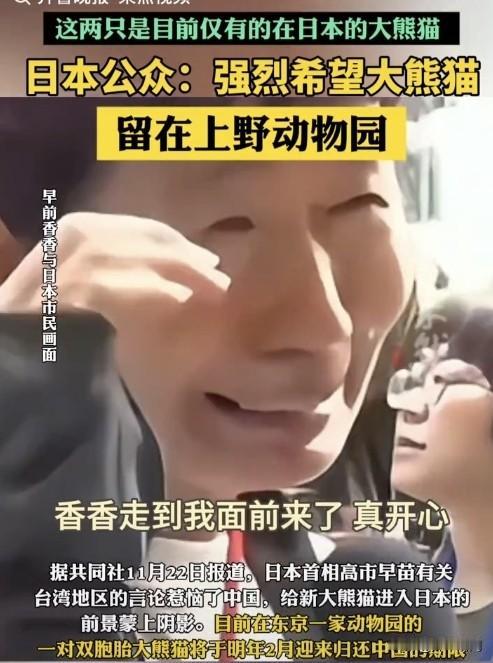 大熊猫“晓晓”和“蕾蕾”即将回国,这两只是目前仅有的在日本的大熊猫了,以后日本没有大熊猫了,也看不到大熊猫了;日本公众:强烈希望大熊猫留在上野动物园;想的真多,异想天开。 她们看到大熊猫真是感动啊,都哭了。 就不应该等到明年2月份,他们根本不配,以后不要租借给他们了。 有网友评价:我小时候也是一样,和别人吵架,肯定要把之前借过他的玩具拿回来。 看到他们哭,大家有什么想说的吗?