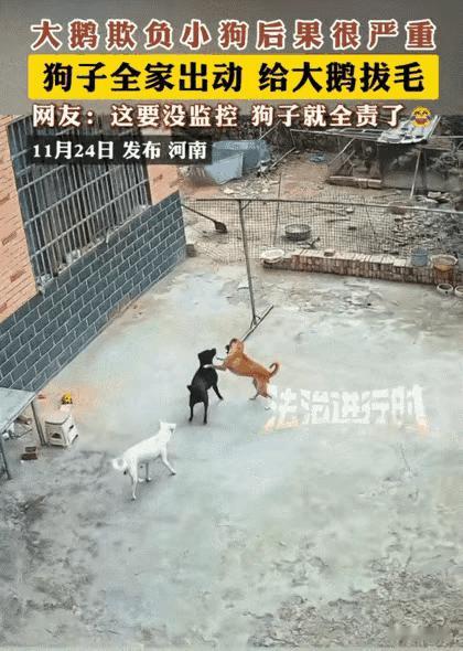 笑不活了家人们!河南这大鹅是把“嚣张”刻进DNA里了吧? 主人出门把大鹅和狗狗们关院子,这货没法出门撒野,居然专挑最小的狗崽欺负,对着人家一顿啄,疼得小狗崽嗷嗷打滚。 它是真没掂量掂量啊!小狗一家都在跟前呢,狗爸狗妈、哥哥姐姐一听娃叫,立马组团冲过来——这哪是教训,分明是“全家复仇”! 大鹅这才慌了神,撒腿就跑,可狗狗们围追堵截,没给它半点逃跑机会,对着大鹅一顿“以牙还牙”。 说真的,谁小时候没被大鹅追过?看见大鹅都得绕着走,可这大鹅千不该万不该,惹了护犊子的狗群! 最后主人回家,大鹅已经没了,虽说有点心疼,但这事真怪不上小狗们——动物世界的规矩就是这么直接,你敢欺负弱小,就得扛住人家的“家族反击”! 你们觉得这大鹅是自讨苦吃,还是狗狗们下手太狠?来评论区聊聊~