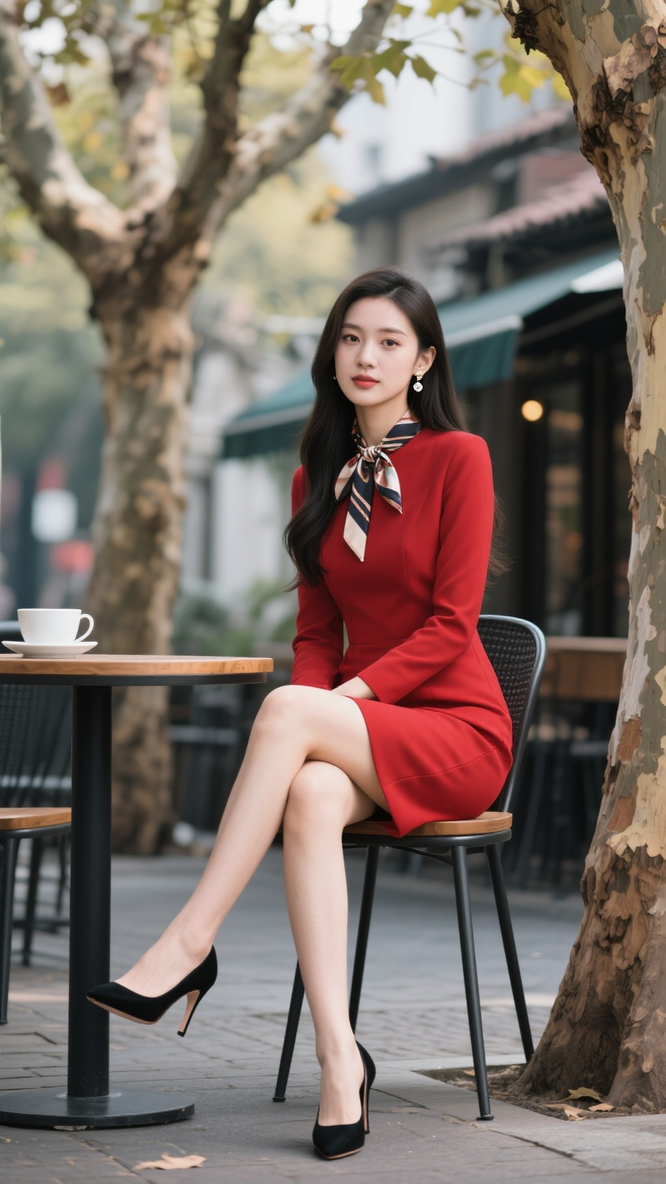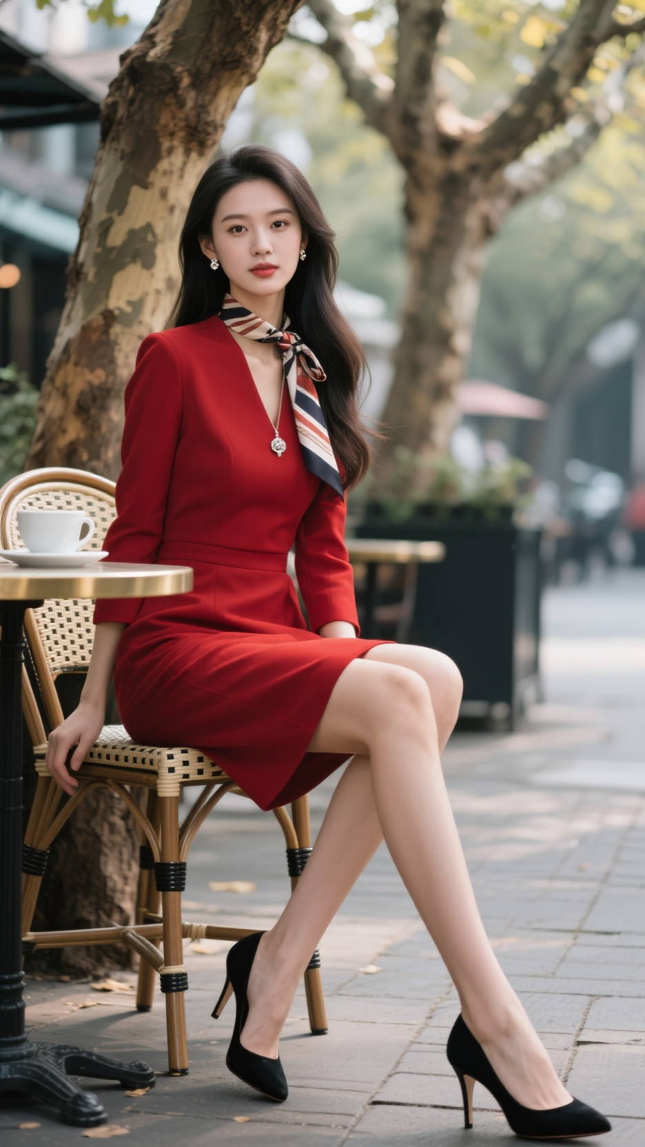 她身着红色修身连衣裙,搭配条纹丝巾与黑色尖头高跟,在街头咖啡座场景中,将 “优雅干练风” 与 “都市氛围感” 融合,吸睛又具格调