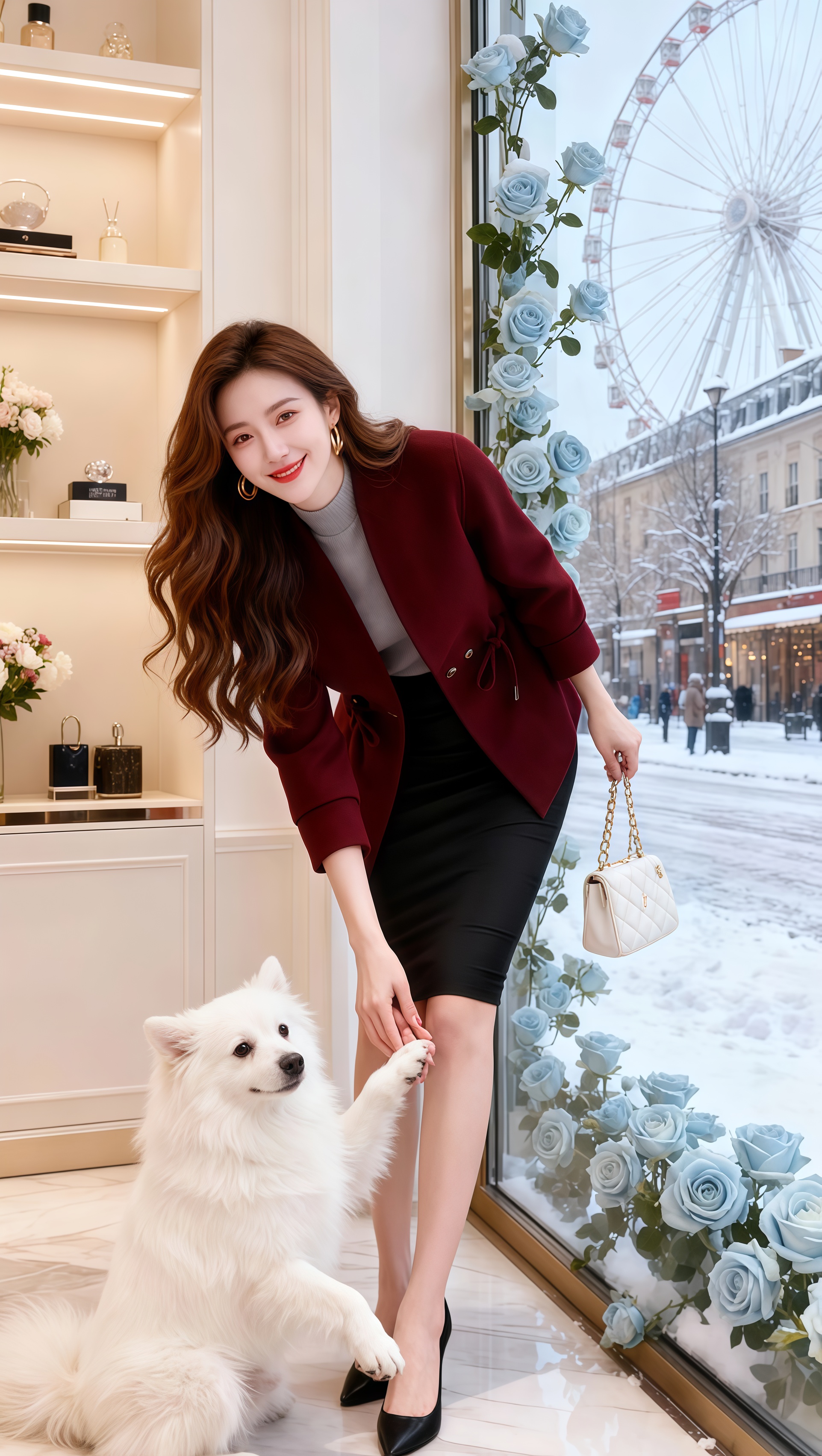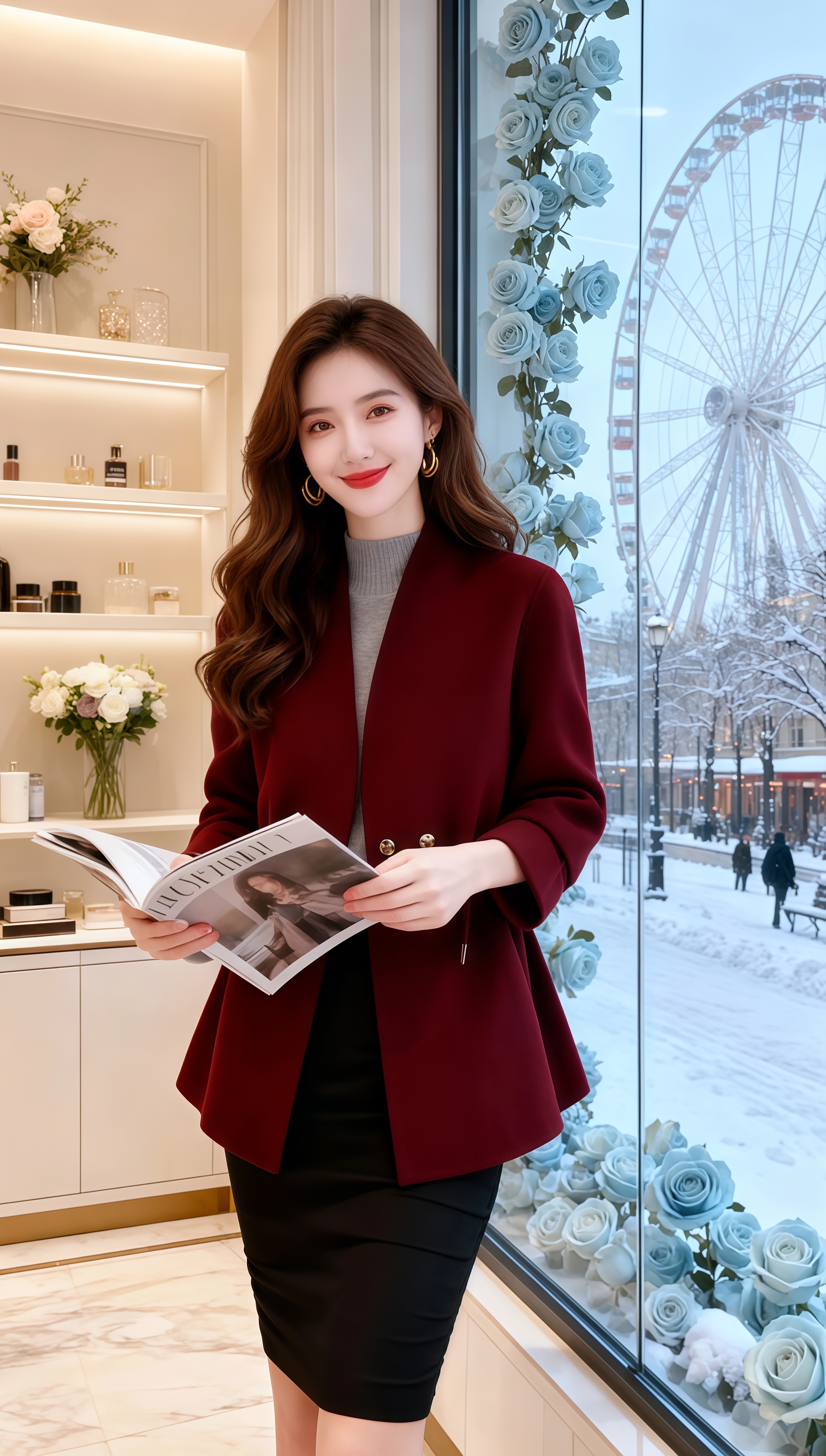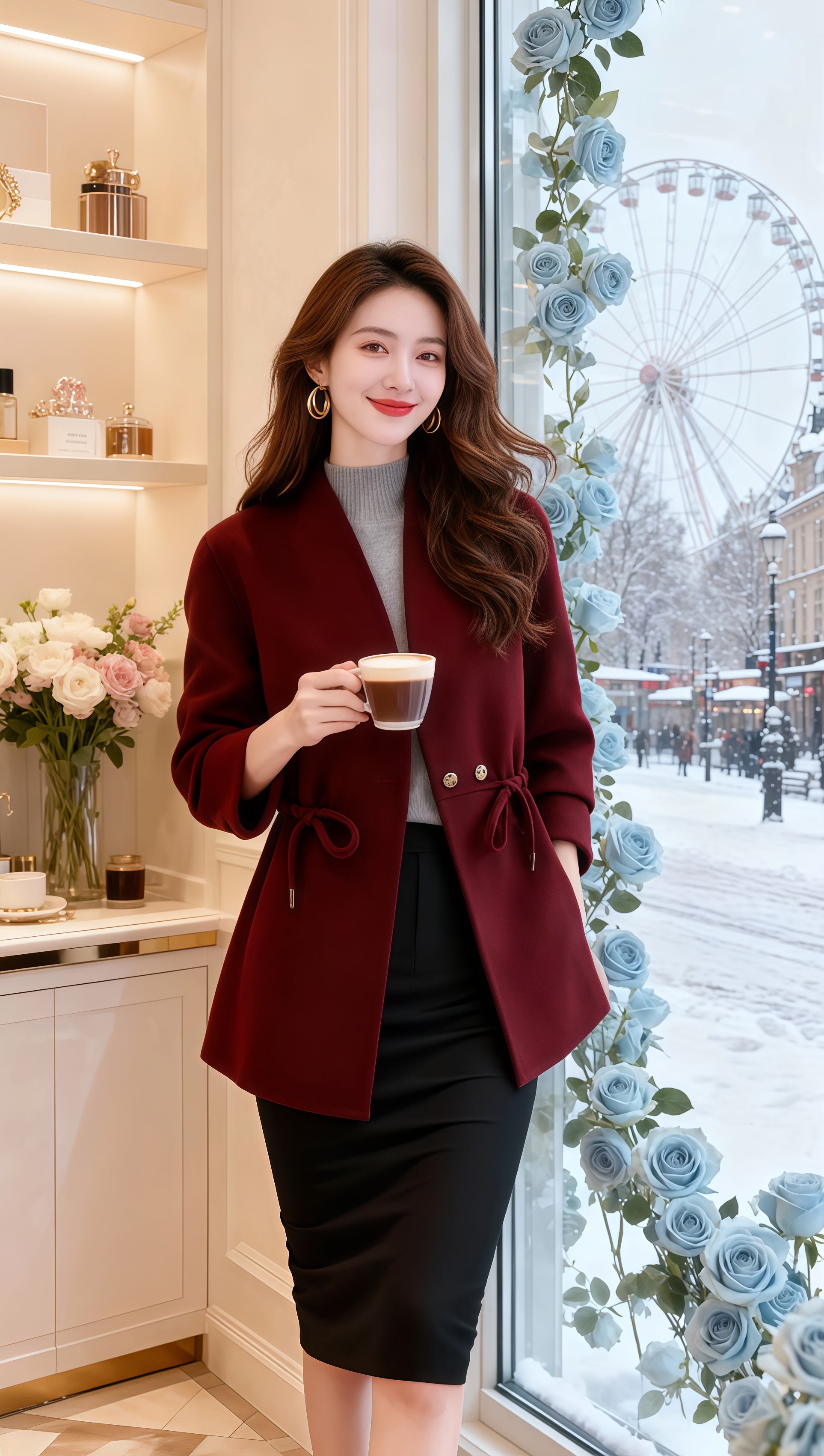 《雪天的酒红优雅:她把通勤装穿成了都市童话》 当摩天轮在初雪的魔都缓缓转动,苏晴调整着酒红外套的抽绳腰带。这套2025秋冬新款穿搭,是她献给职场女性的“温柔铠甲”——收腰设计勾勒曼妙身姿,七分袖添了几分灵动,内搭灰色高领与黑色包臀裙的组合,把“轻熟通勤风”演成了都市剧女主的日常。 晨会时,同事夸她“今天气场绝了”;下午茶时,咖啡师盯着她的穿搭问了链接。就连家里的白博美,都在她俯身时亲昵地蹭着裤脚。 “原来优雅从不是刻板,是每一次对自我风格的笃定。”苏晴对着窗边的蓝玫瑰浅笑,窗外雪景皑皑,窗内她活成了轻熟女的穿搭范本。