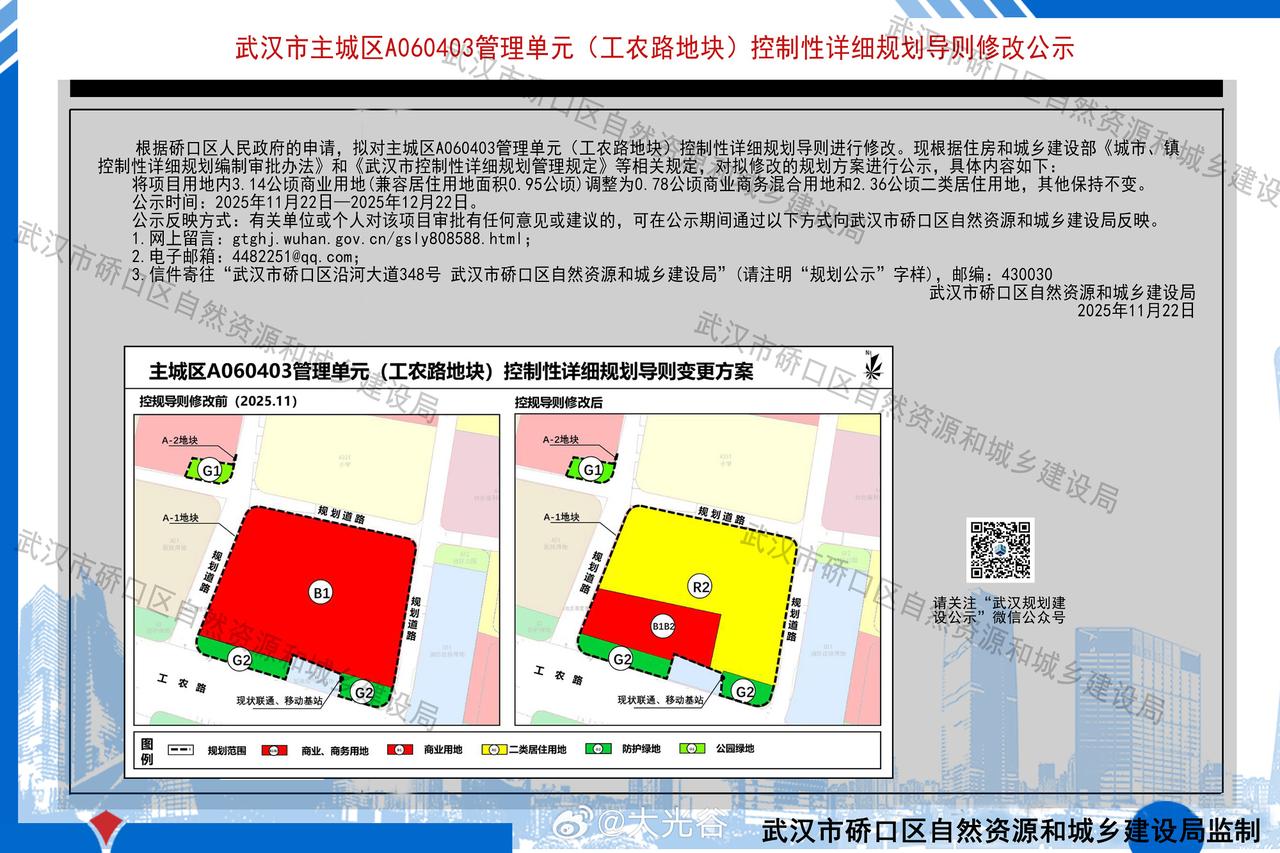 硚口工农路9号商业地块大面积调整为住宅 11月22日,硚口区自然资源和城乡建设局根据申请,拟对主城区A060403管理单元(工农路地块)控制性详细规划导则进行修改。将项目用地内3.14公顷商业用地(兼容居住用地面积0.95公顷)调整为0.78公顷商业商务混合用地和2.36公顷二类居住用地,其他保持不变。