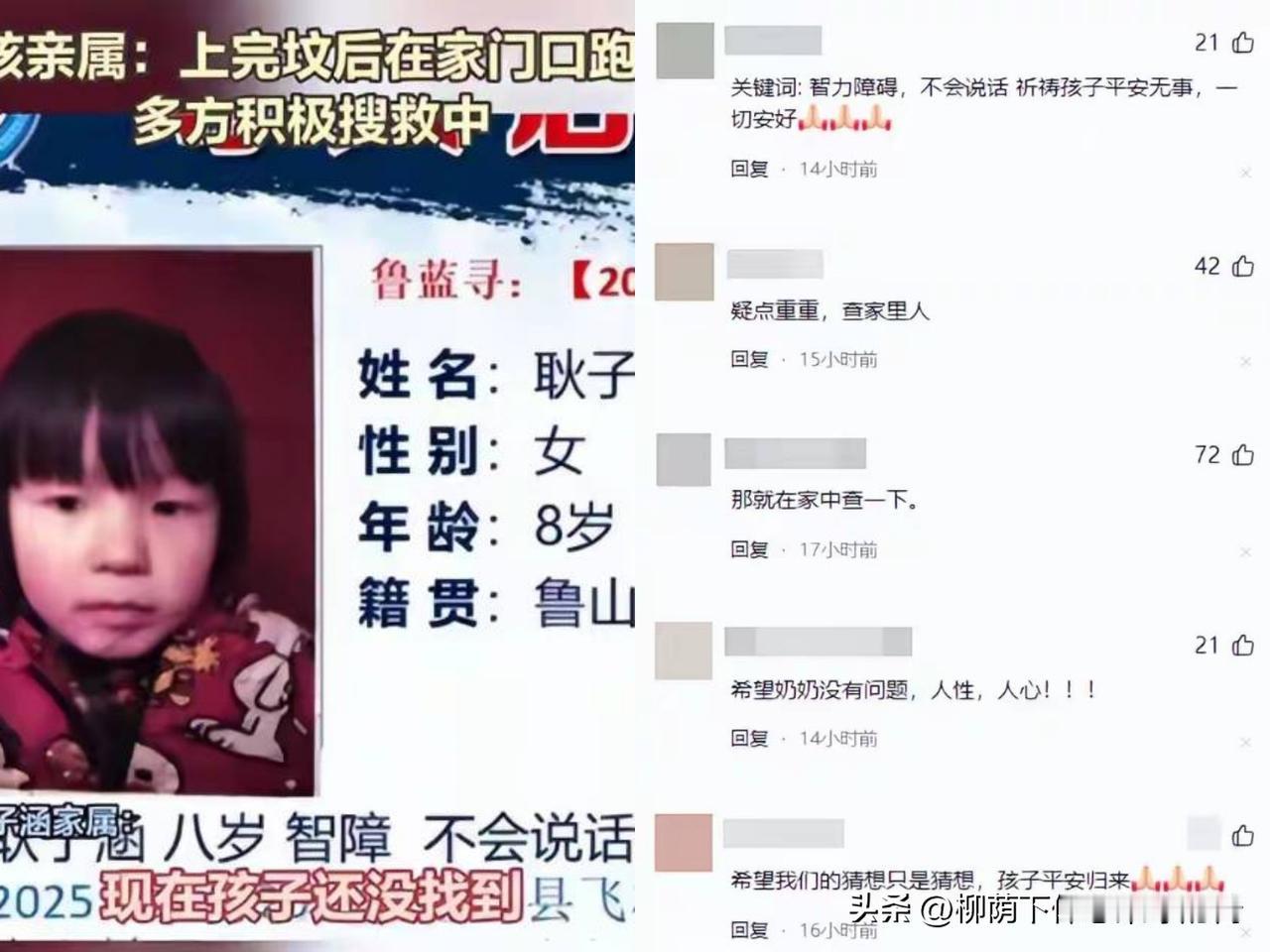 8岁自闭症女童失联4天! 上坟途中凭空消失 网友怒怼奶奶真的合理吗? 冷到降雪的天气里,奶奶带孩子扫墓,停车歇十分钟孩子就没了,换谁都着急,但把矛头直接对准老人真的太偏激了。自闭症孩子本就有80%的走失风险,这娃还不会说话、智力发育迟缓,危险系数直接翻倍,他们的行为根本不按常理出牌,可能盯着一片叶子就跑远,躲进玉米垛或废窑里,无人机都找不到。警犬循味跑回自家就是最好的证明,不是大人没看好,是这类孩子的监护难度本就超出想象。真正该关注的是农村监控覆盖率低、搜救盲区多的问题,还有怎么给特殊孩子做好防护。你觉得网友的质疑太苛刻,还是奶奶真有没说清的细节?自闭症小孩妈妈 九岁女孩失联 2岁半失踪女童 辽宁4岁娃失踪 8岁失联男孩 八岁女童失踪 八岁失踪男孩